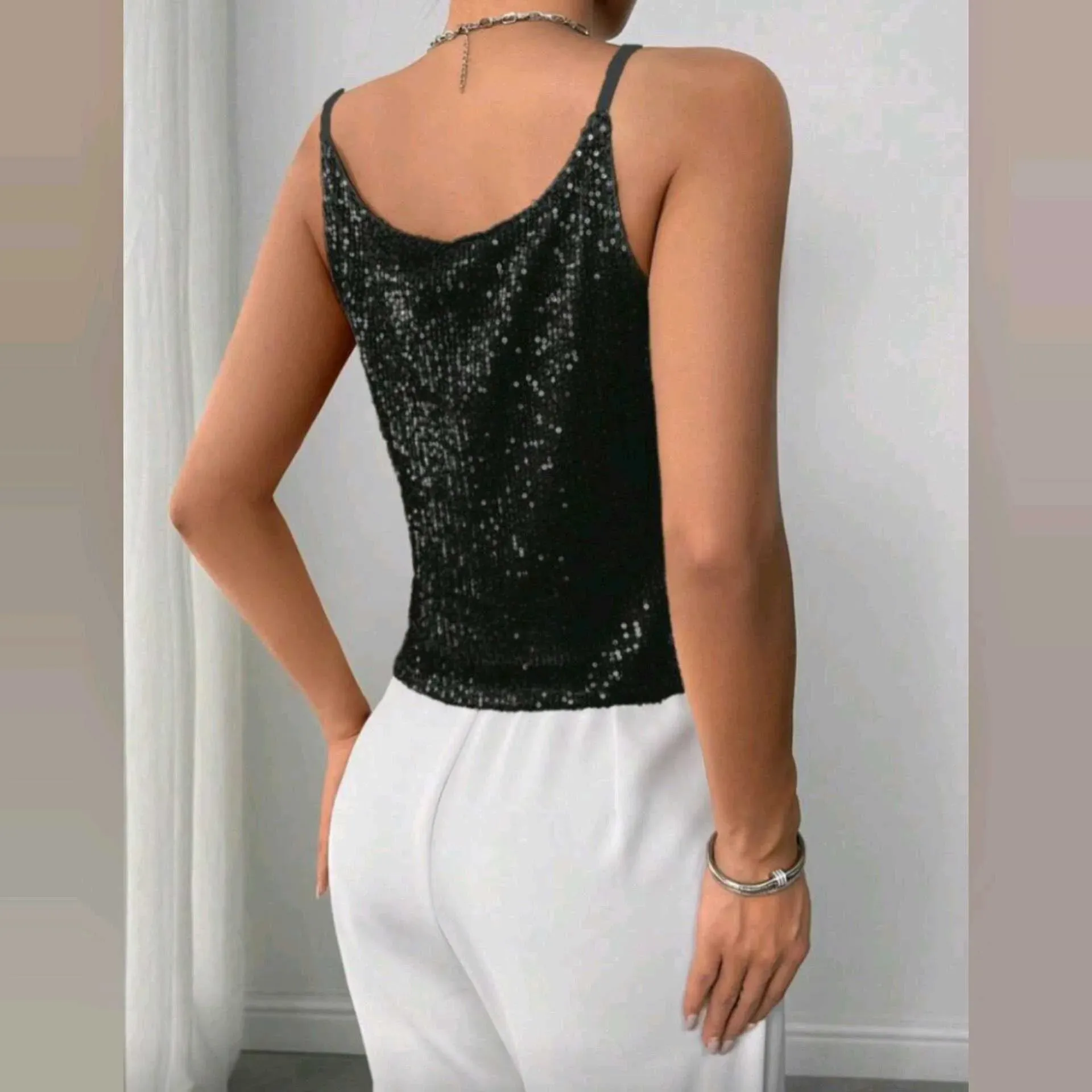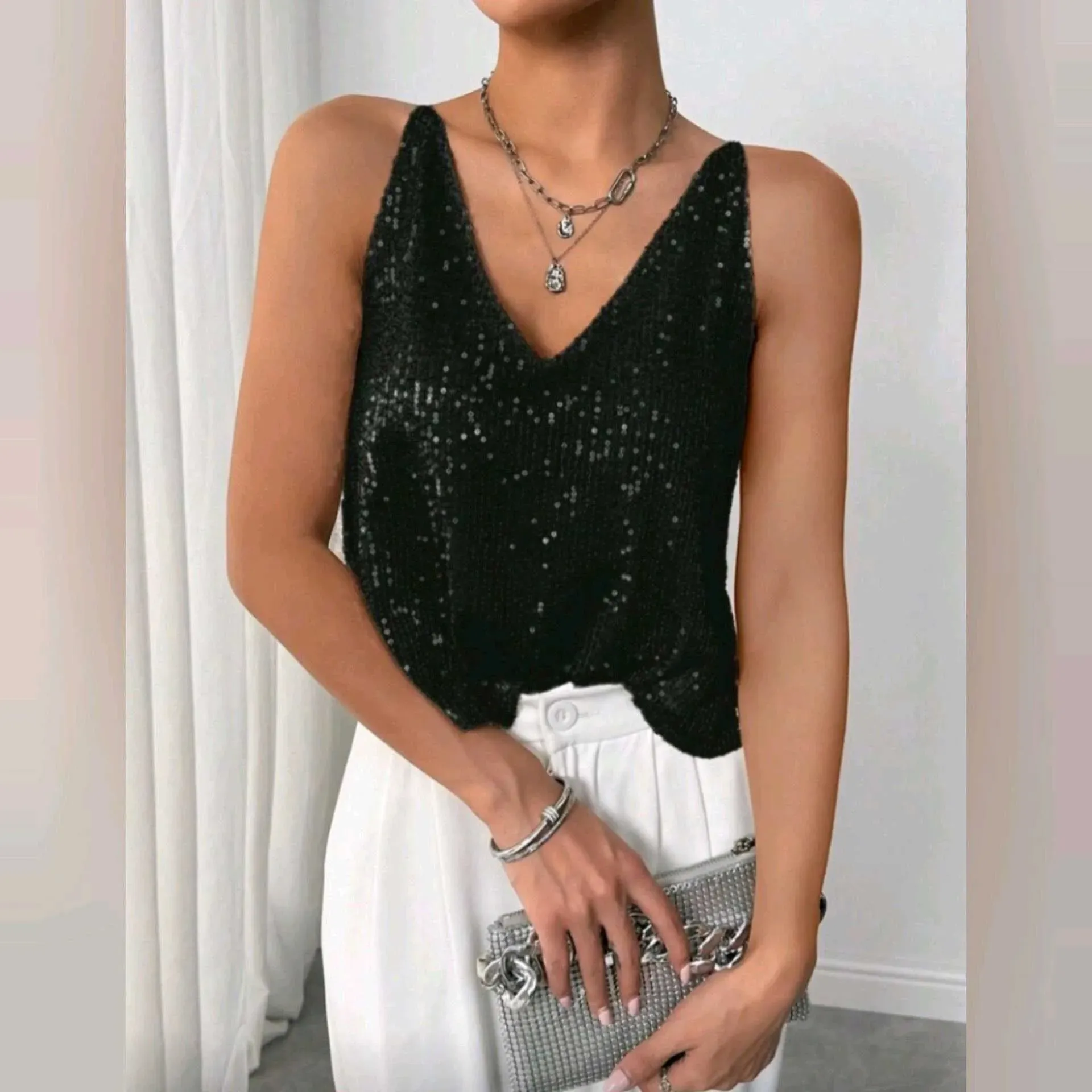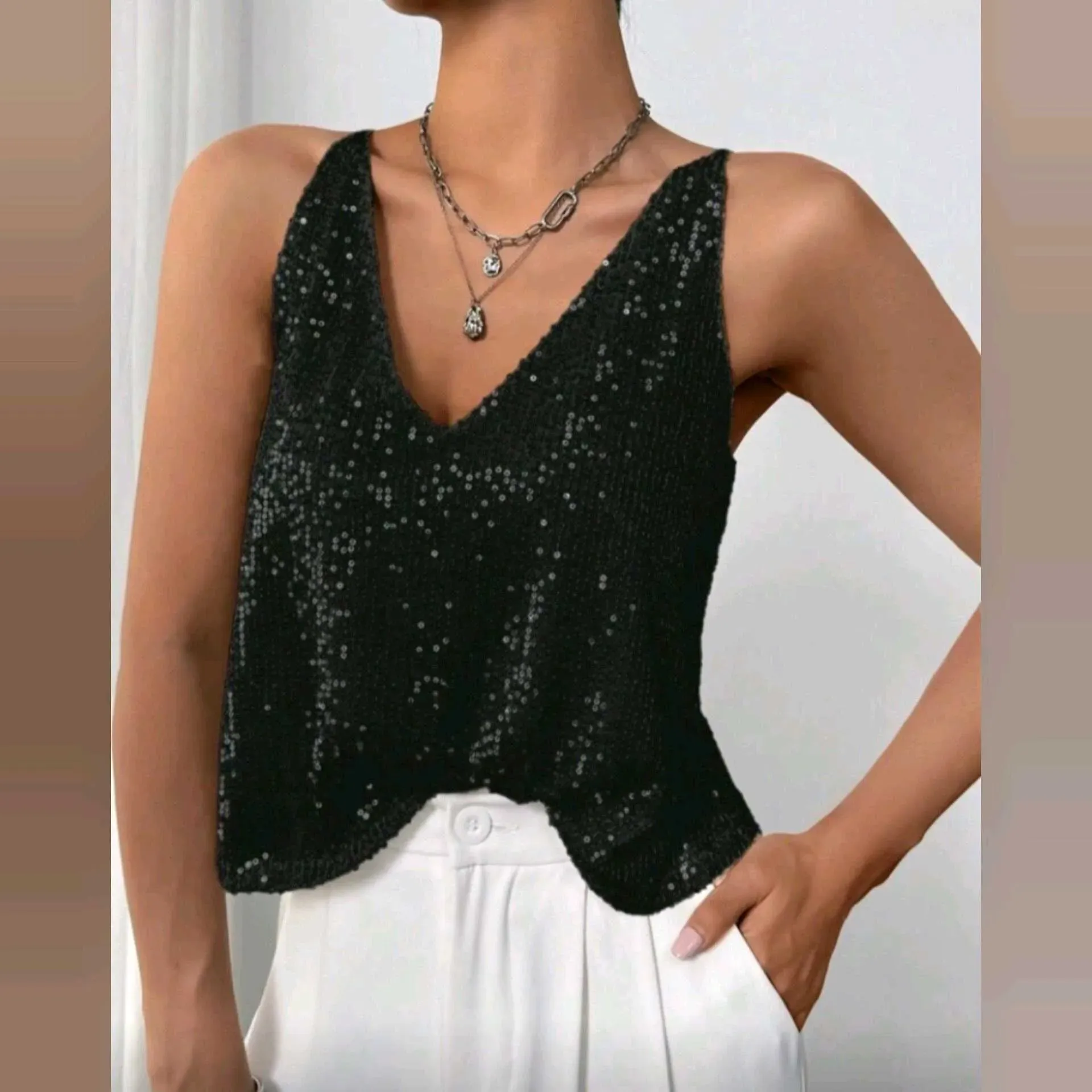 ✨ Blusa de Lentejuelas Negra – Brillo Chic para Tus Noches EspecialesUn clásico moderno con toque glam 🖤Esta blusa de tirantes con lentejuelas es perfecta para elevar cualquier look. Su escote en V favorece la figura, mientras que el brillo sutil del tej