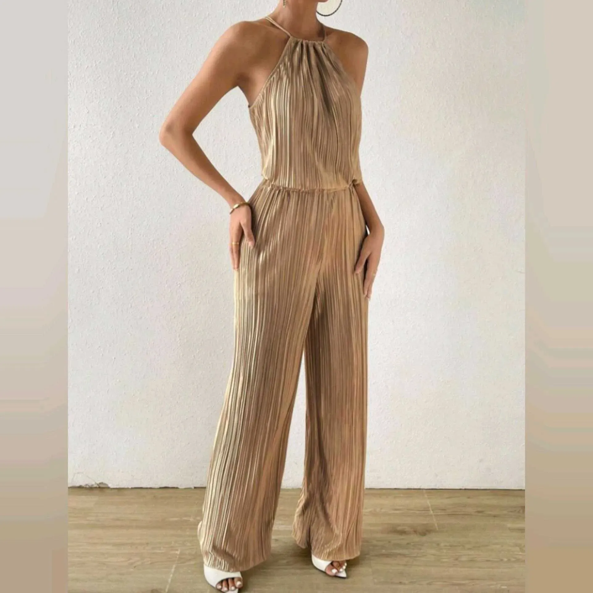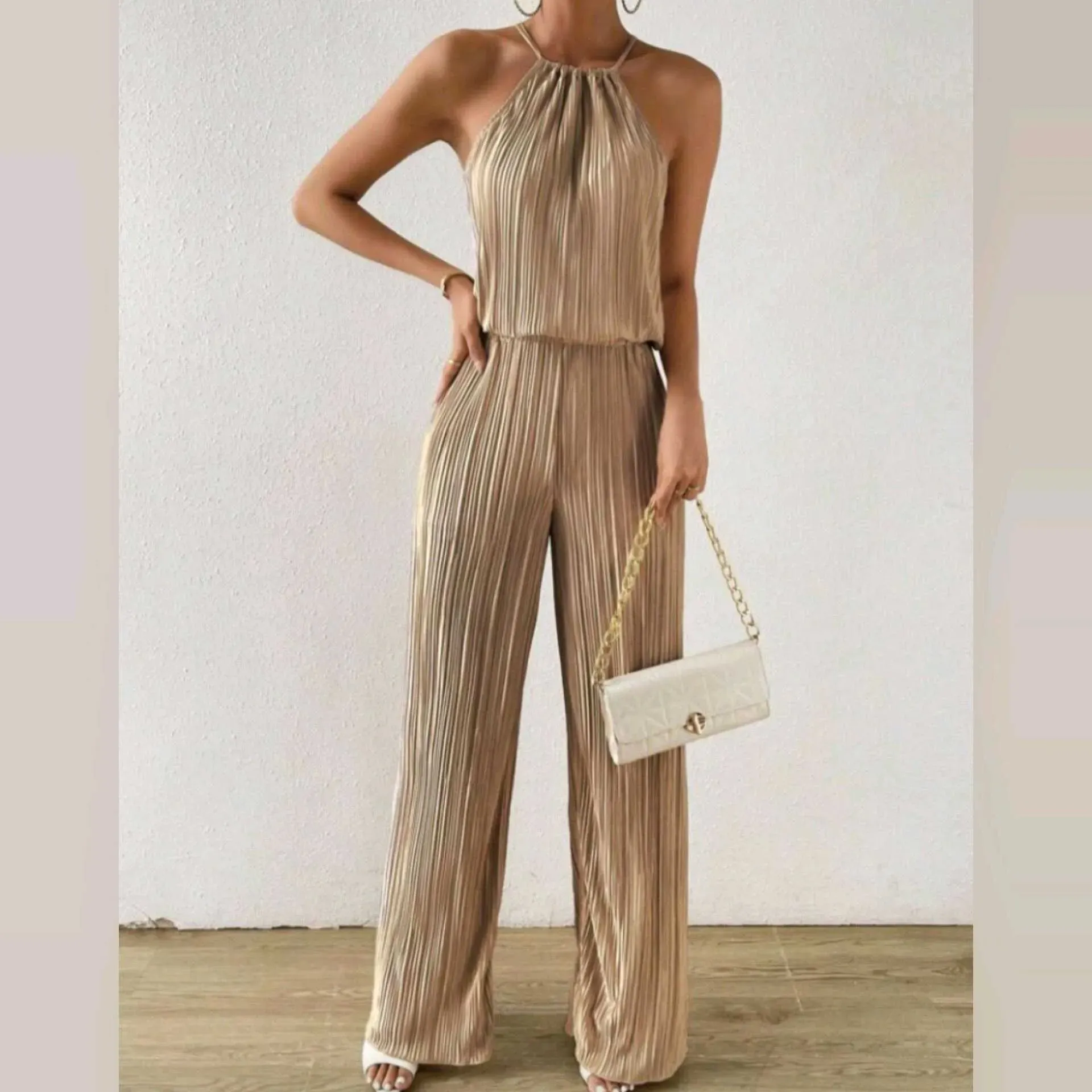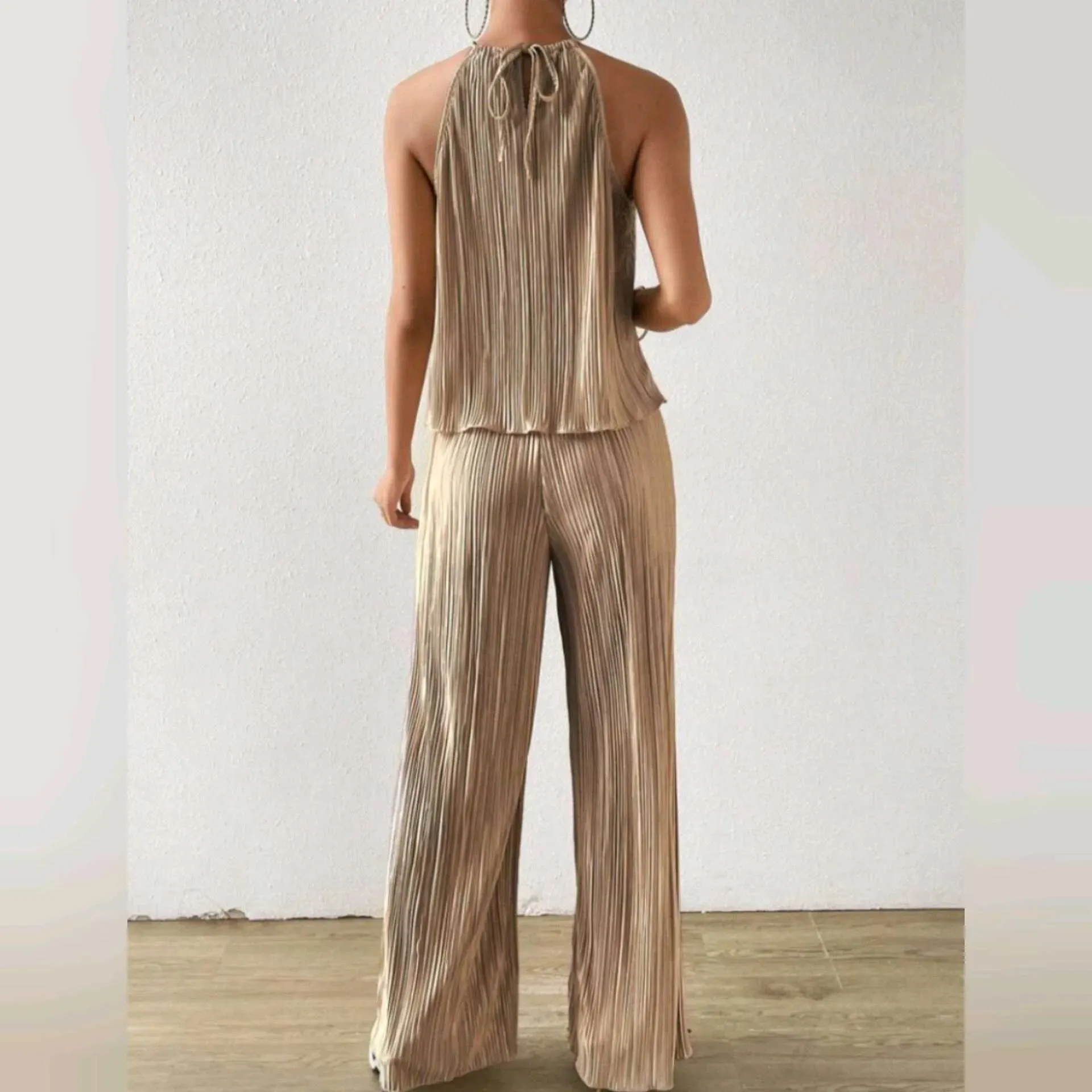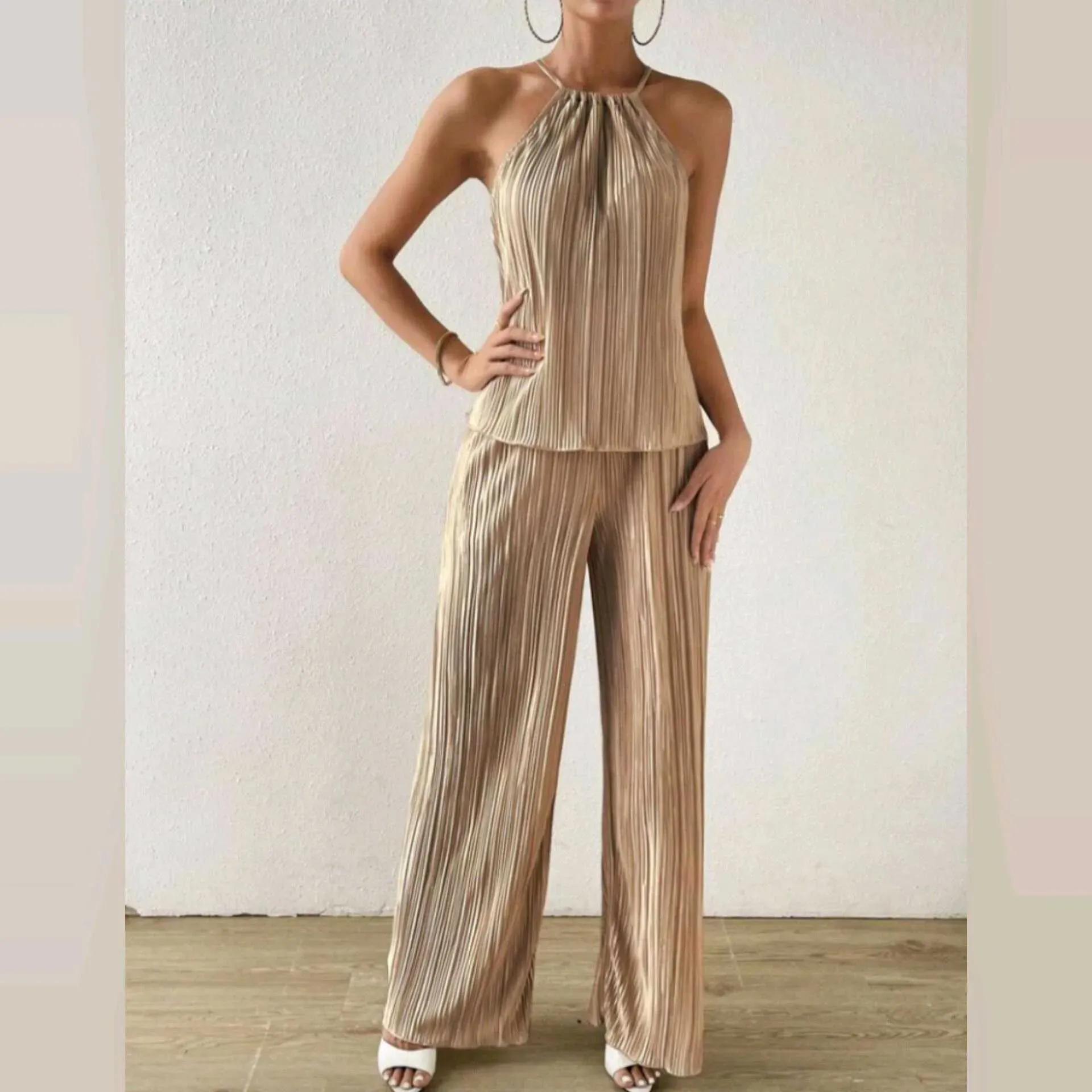 ✨ Conjunto Satín Plisado Dorado – Elegancia Ligera y Estilo SofisticadoBrilla sin esfuerzo con este conjunto ideal para eventos, cenas o vacaciones 🌙El set satinado plisado dorado combina una blusa halter con caída fluida y un pantalón palazzo de cintura