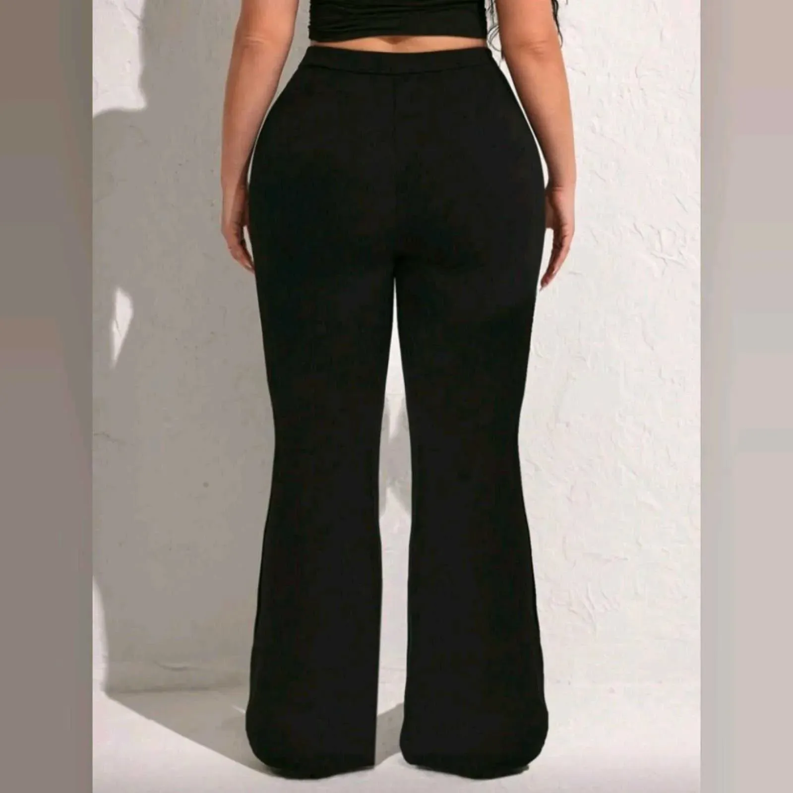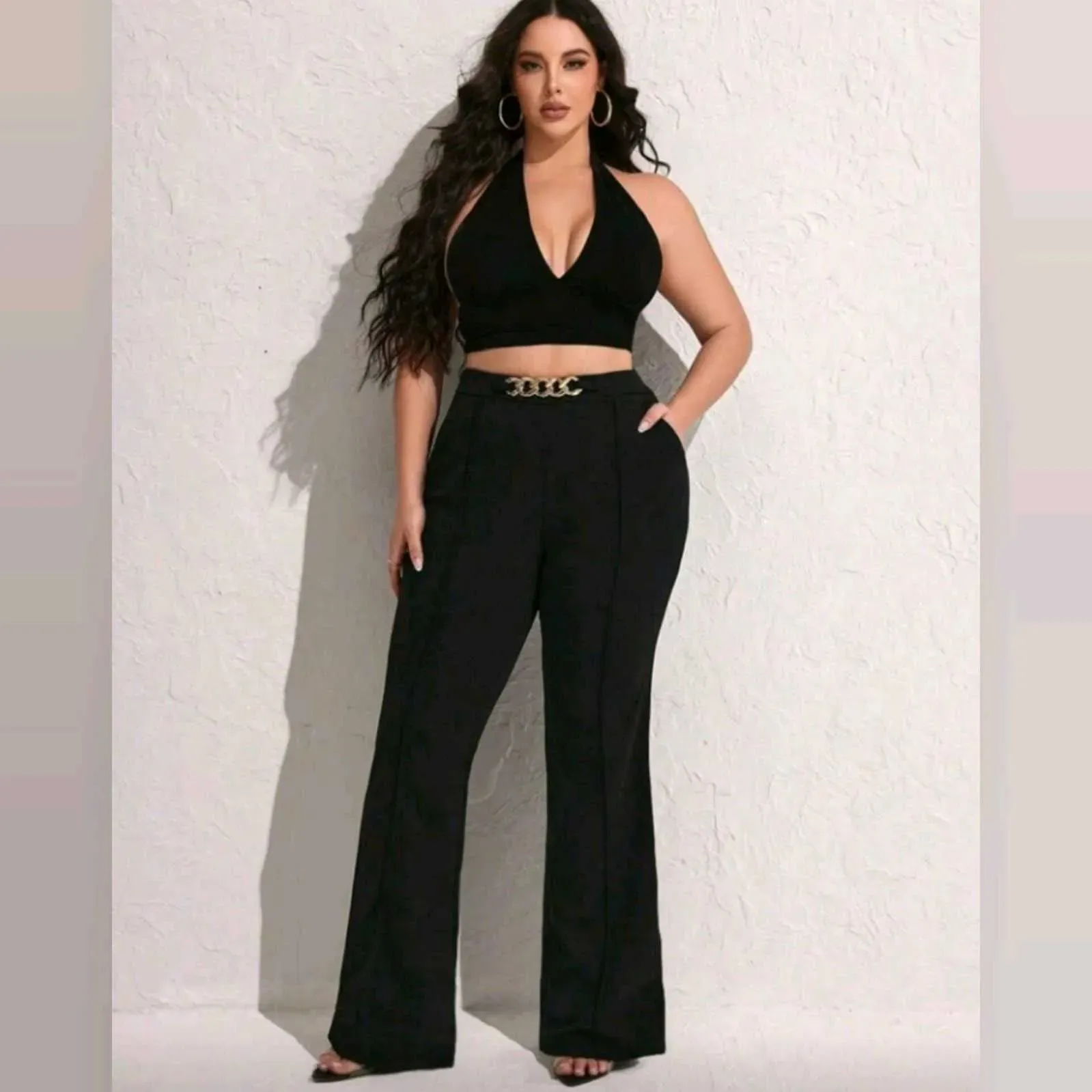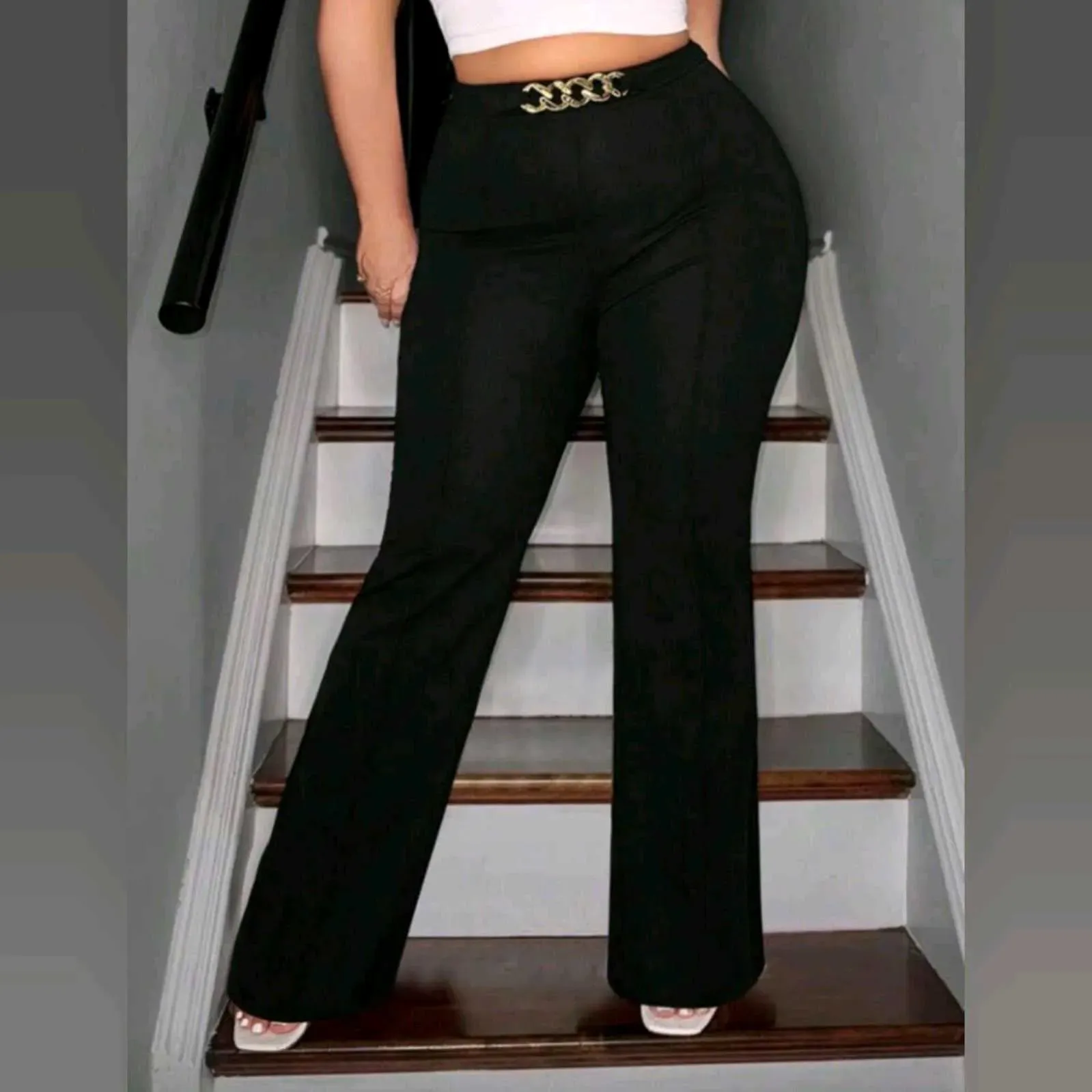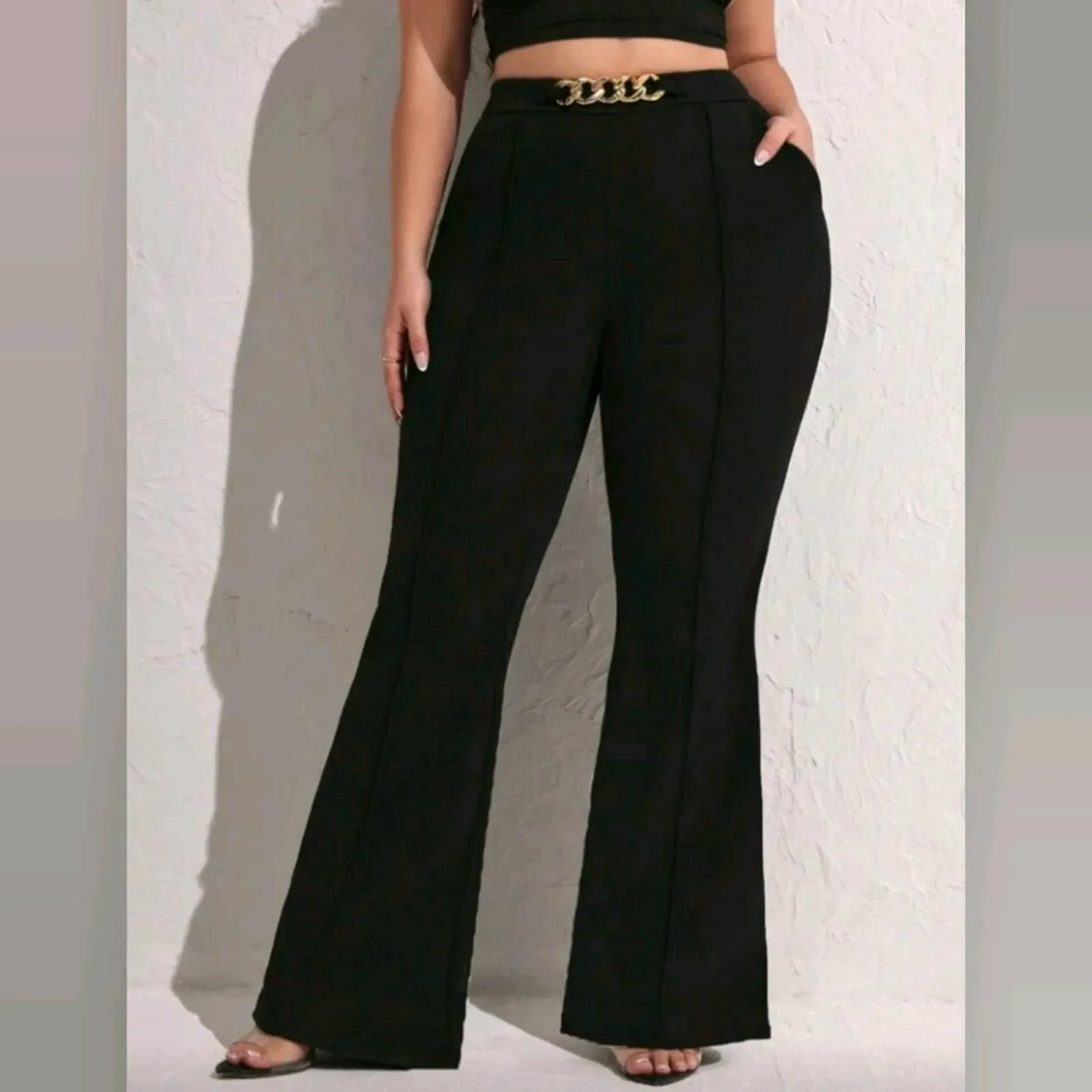 🖤 Pantalón Negro con detalle de Cadena Dorada Curvy Plus – Estilo Sofisticado y Moderno 🖤Un básico con un toque de elegancia ✨Este pantalón Shein estilo flare (bota ancha) con detalle de cadena dorada en la cintura es ideal para realzar tu figura y elev