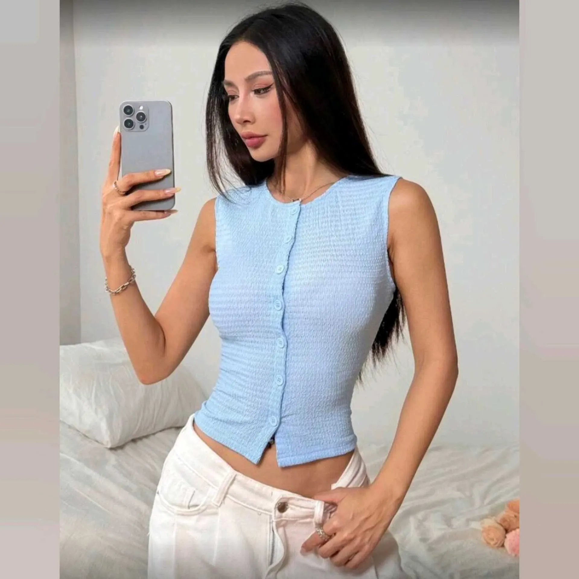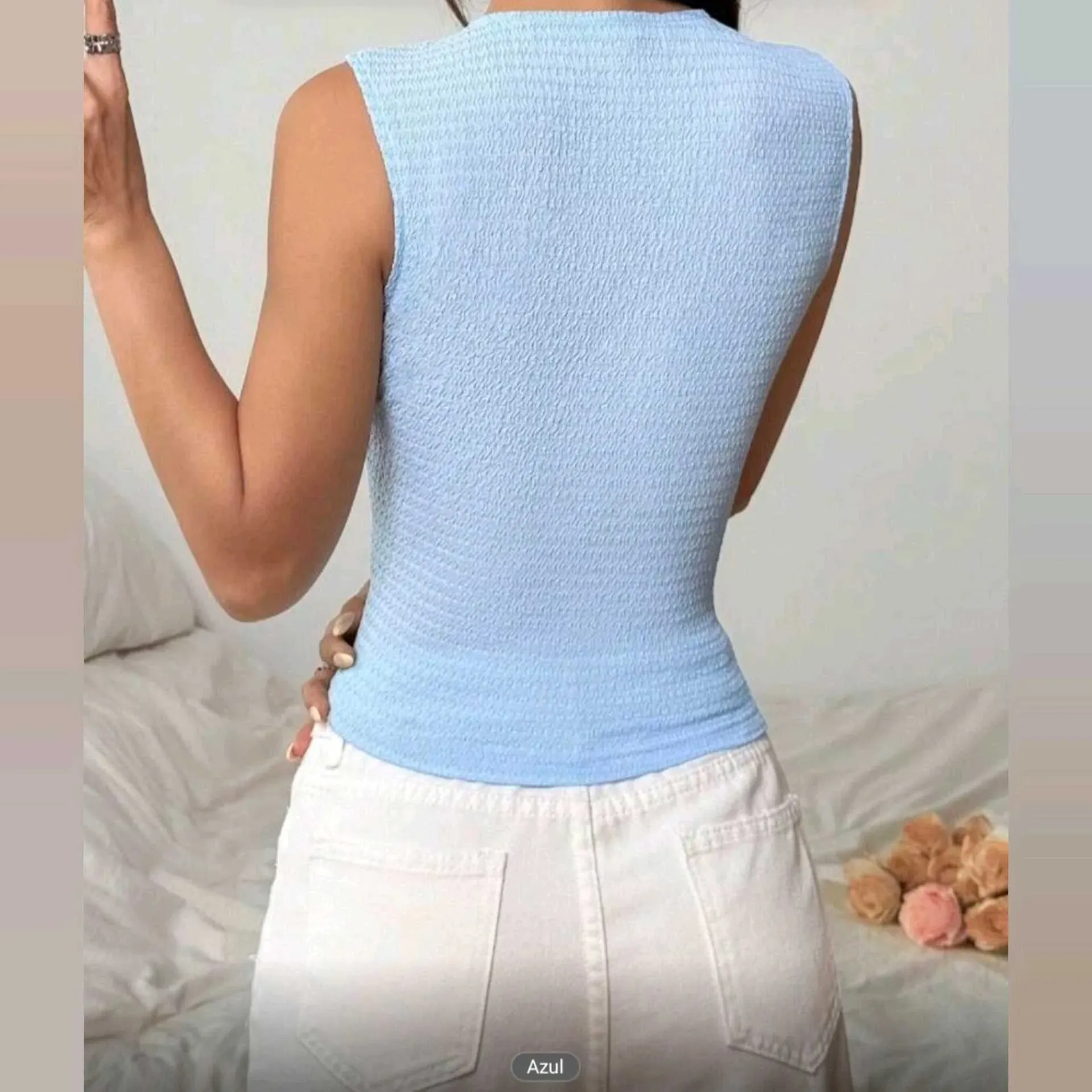 💙 SHEIN EZwear Top Crop Azul de Punto Canalé con Botones Frontales 💙Un básico fresco y chic de SHEIN EZwear, ideal para tus looks casuales del día a día. Este top crop tejido en canalé resalta tu figura con su ajuste ceñido, escote redondo clásico y abo