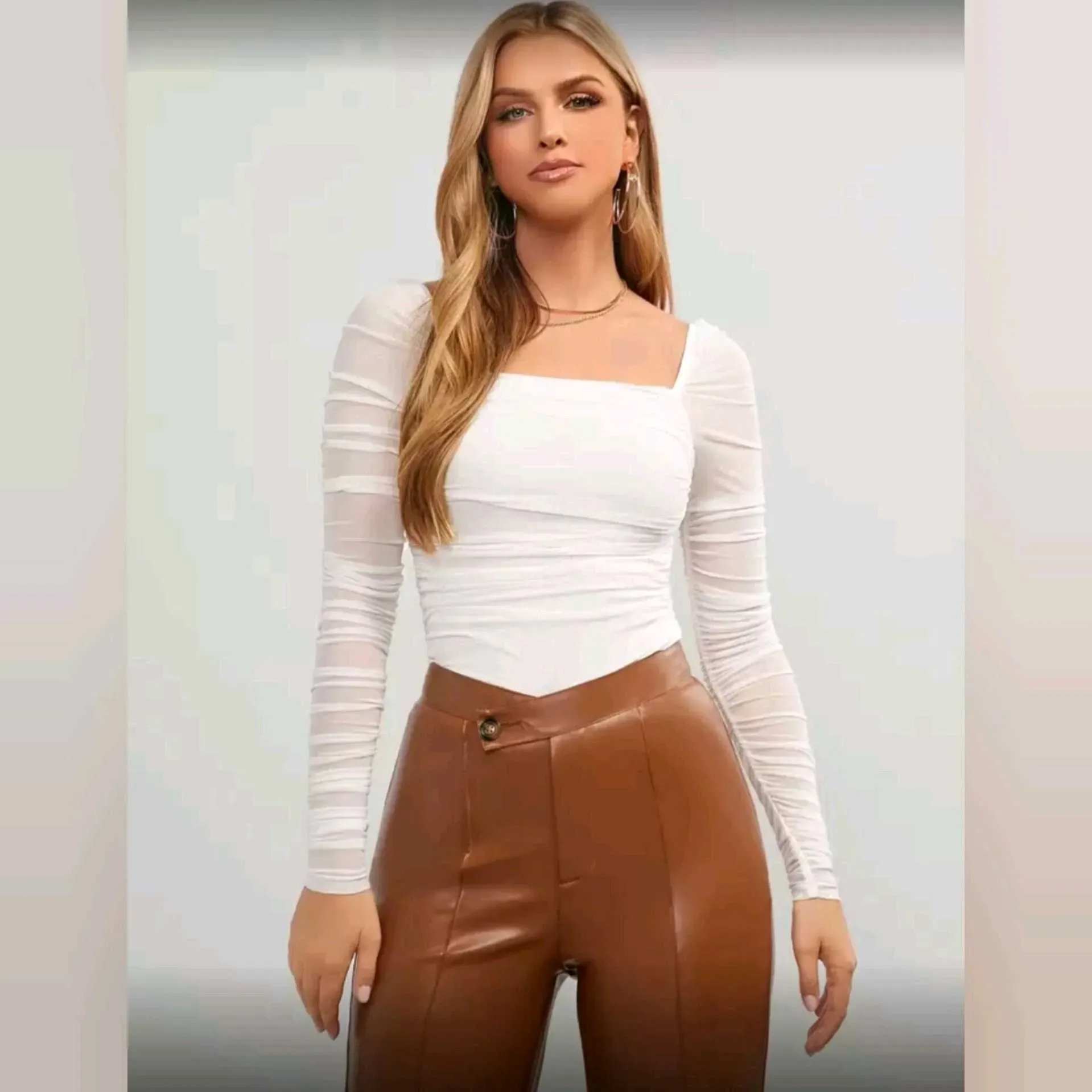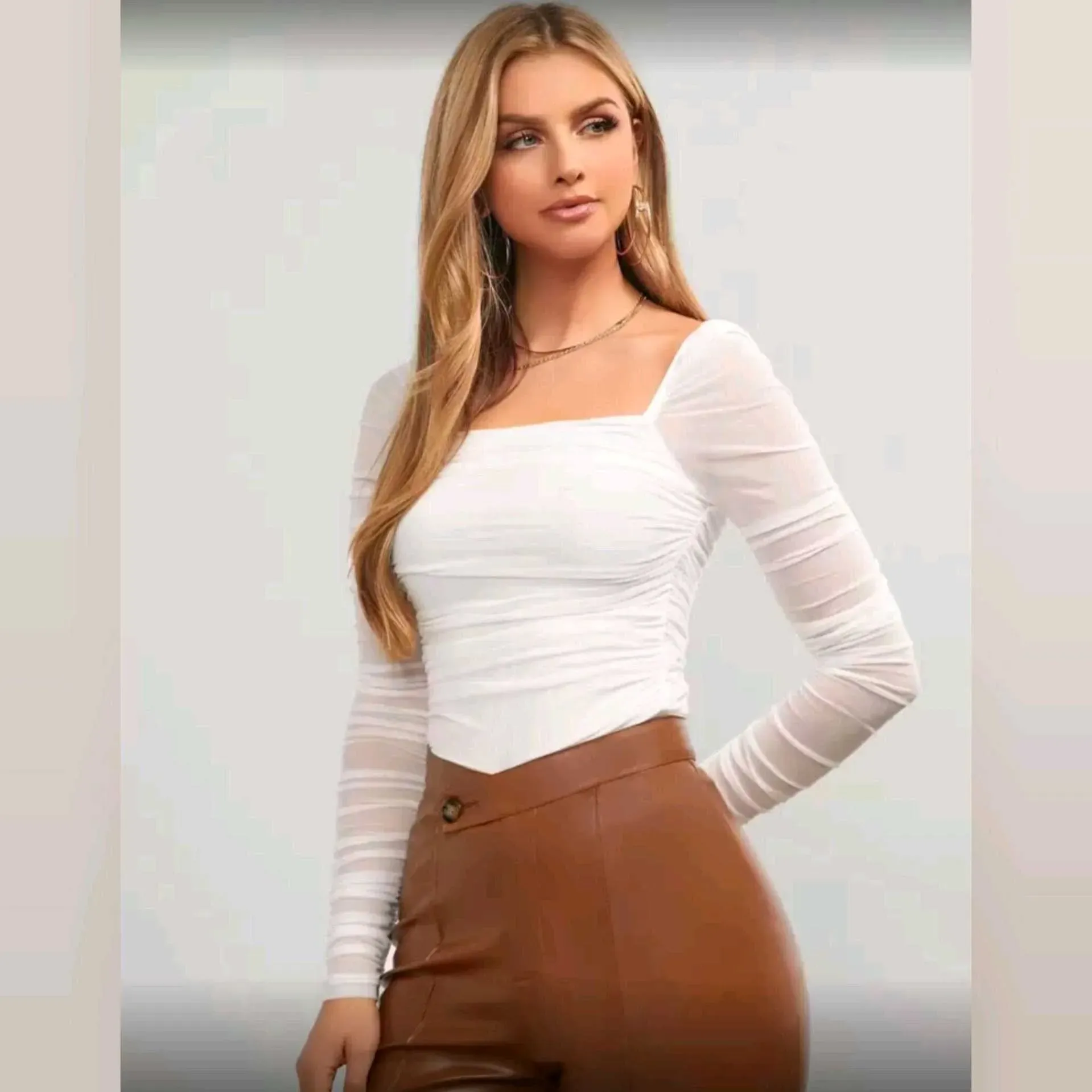 ✨ Top Blanco Shein Bae de Malla Fruncida con Cuello CuadradoUn básico moderno que resalta la feminidad con elegancia 🤍Este top Shein Bae combina suavidad y estilo gracias a su tela de malla fruncida que se ajusta cómodamente al cuerpo.El escote cuadrado