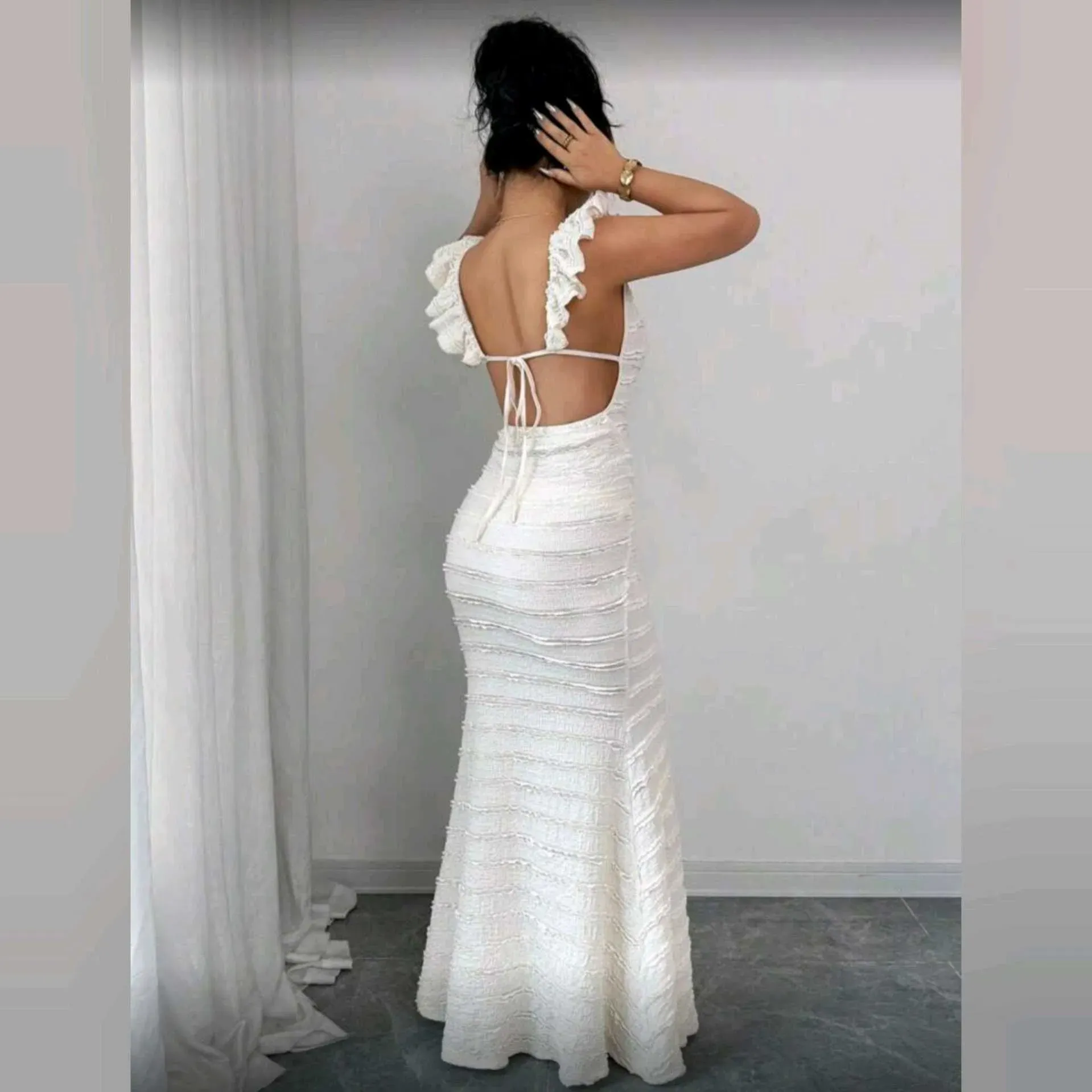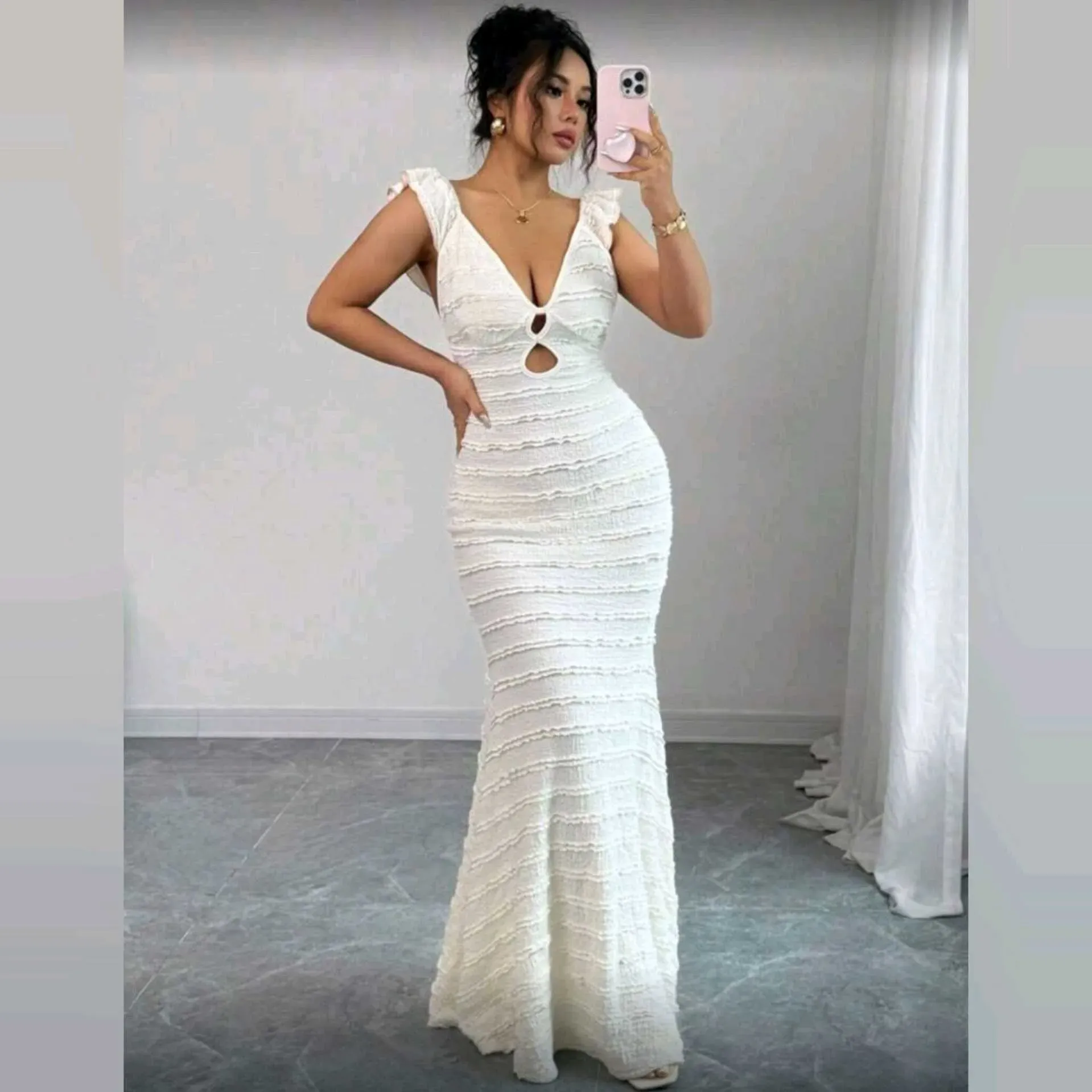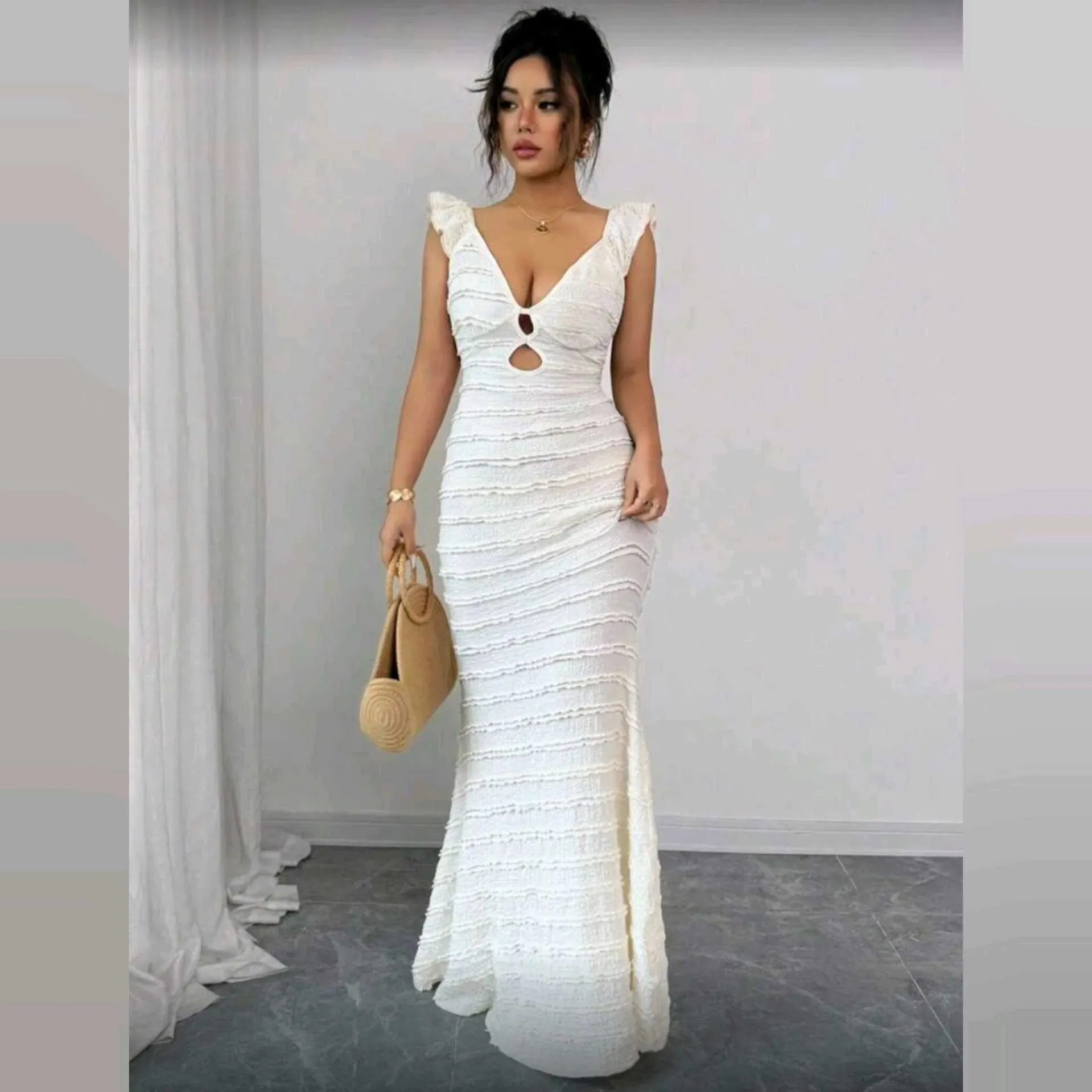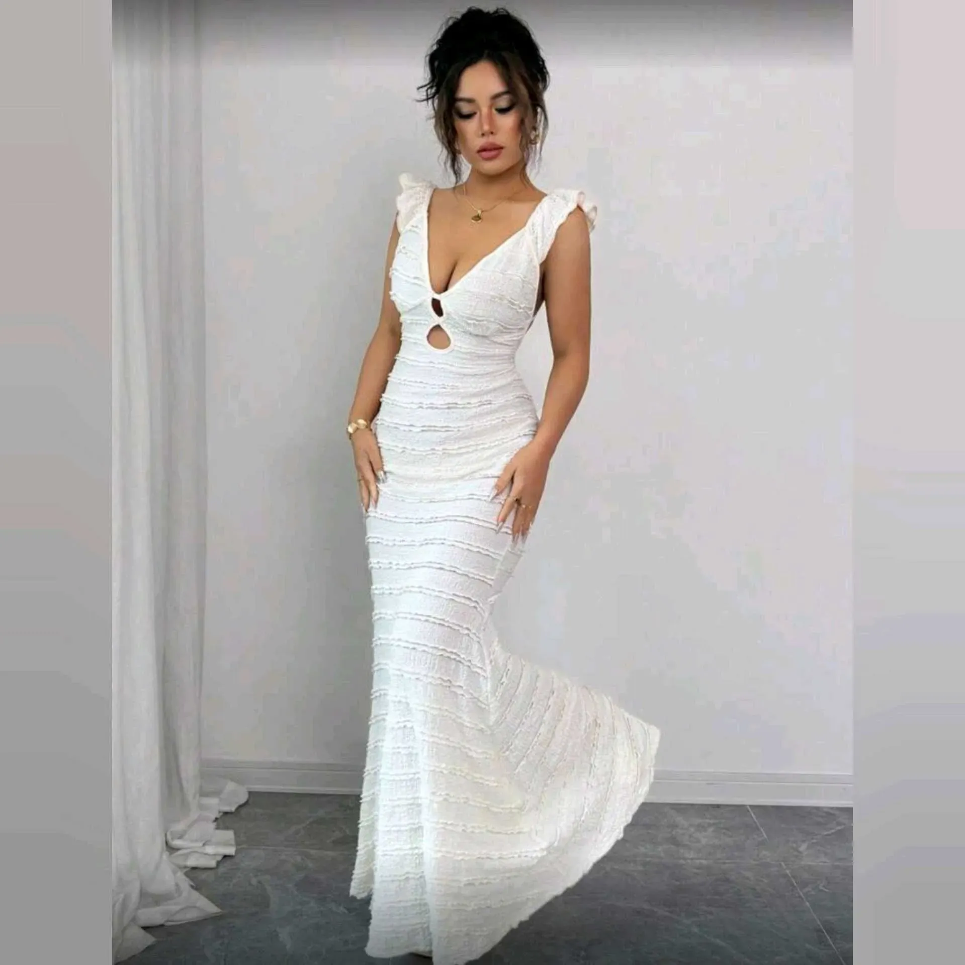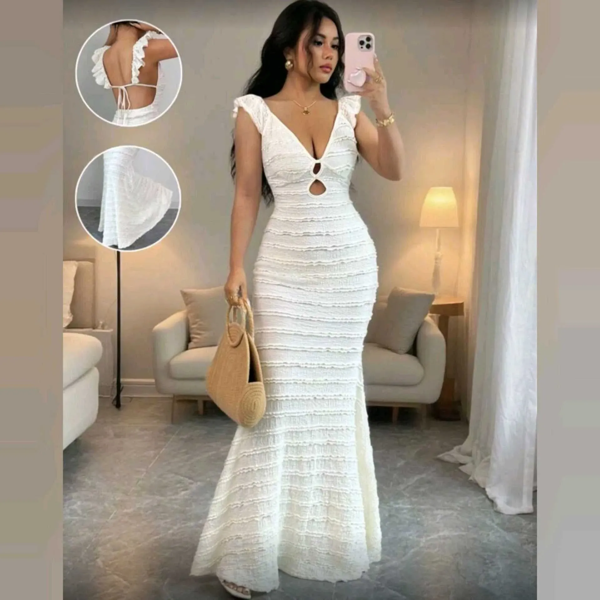 🤍 Vestido Blanco IslaLuna – Perfecto para Vacacionar o Eventos EspecialesElegante, fresco y lleno de encanto ✨Este vestido combina la textura estilo nido de abeja con un escote en V profundo y espalda abierta, realzando la silueta con un toque romántico