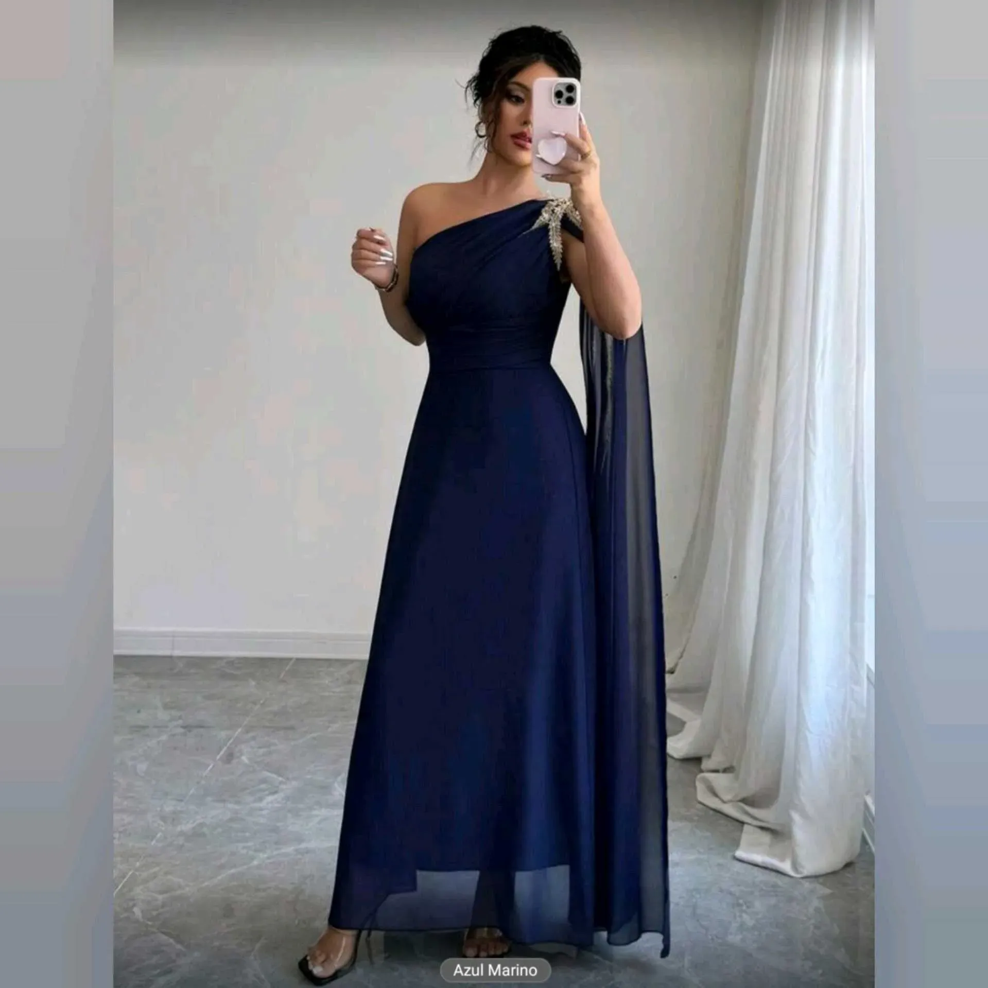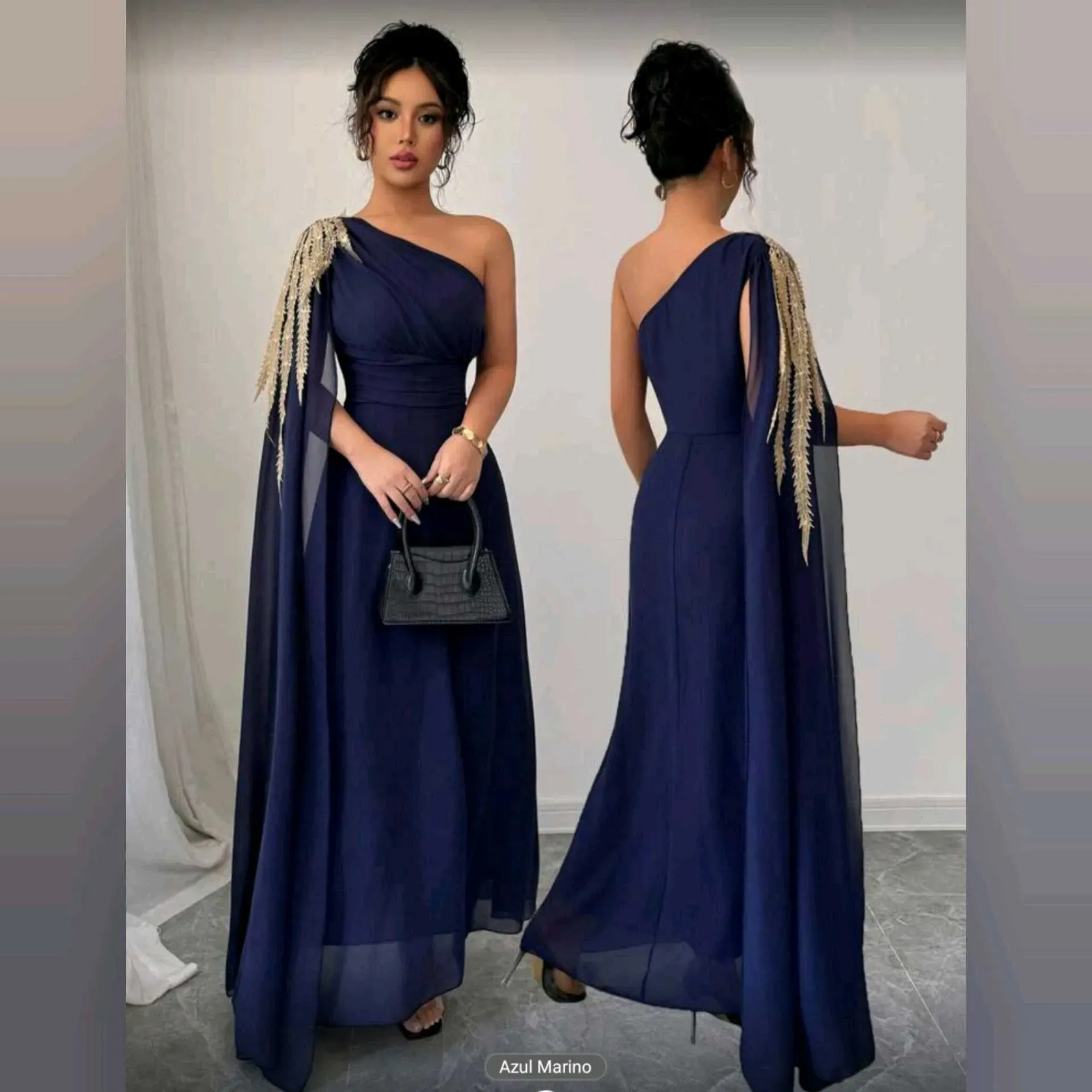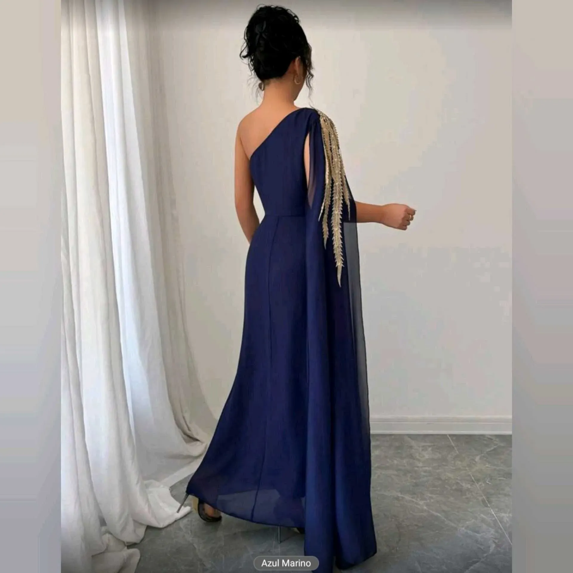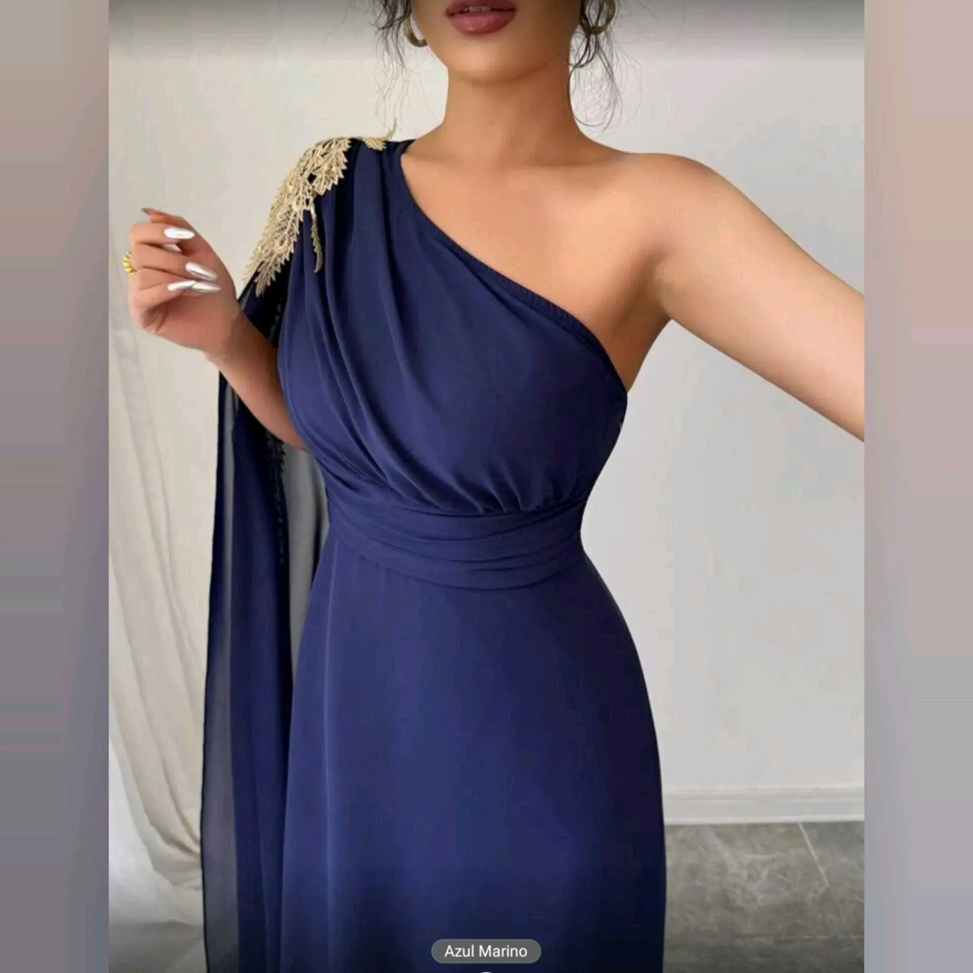 💙 Vestido Breezaya Azul Noche – Glamour y Distinción en Cada PasoElegancia que roba miradas ✨Este vestido Breezaya combina la fluidez del tul azul noche con un diseño de un solo hombro, adornado con bordados dorados que añaden un toque de lujo y sofistic
