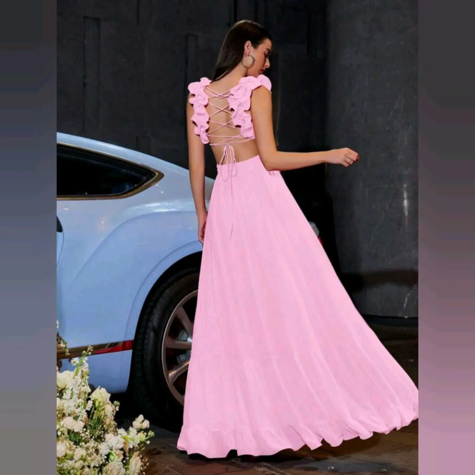 💗 Vestido Largo Rosa con Espalda Ajustable – Romanticismo y MovimientoUn diseño que roba miradas con su encanto femenino ✨Este vestido largo en tono rosa pastel combina un estilo romántico con un toque moderno gracias a su espalda con lazo entrecruzado y