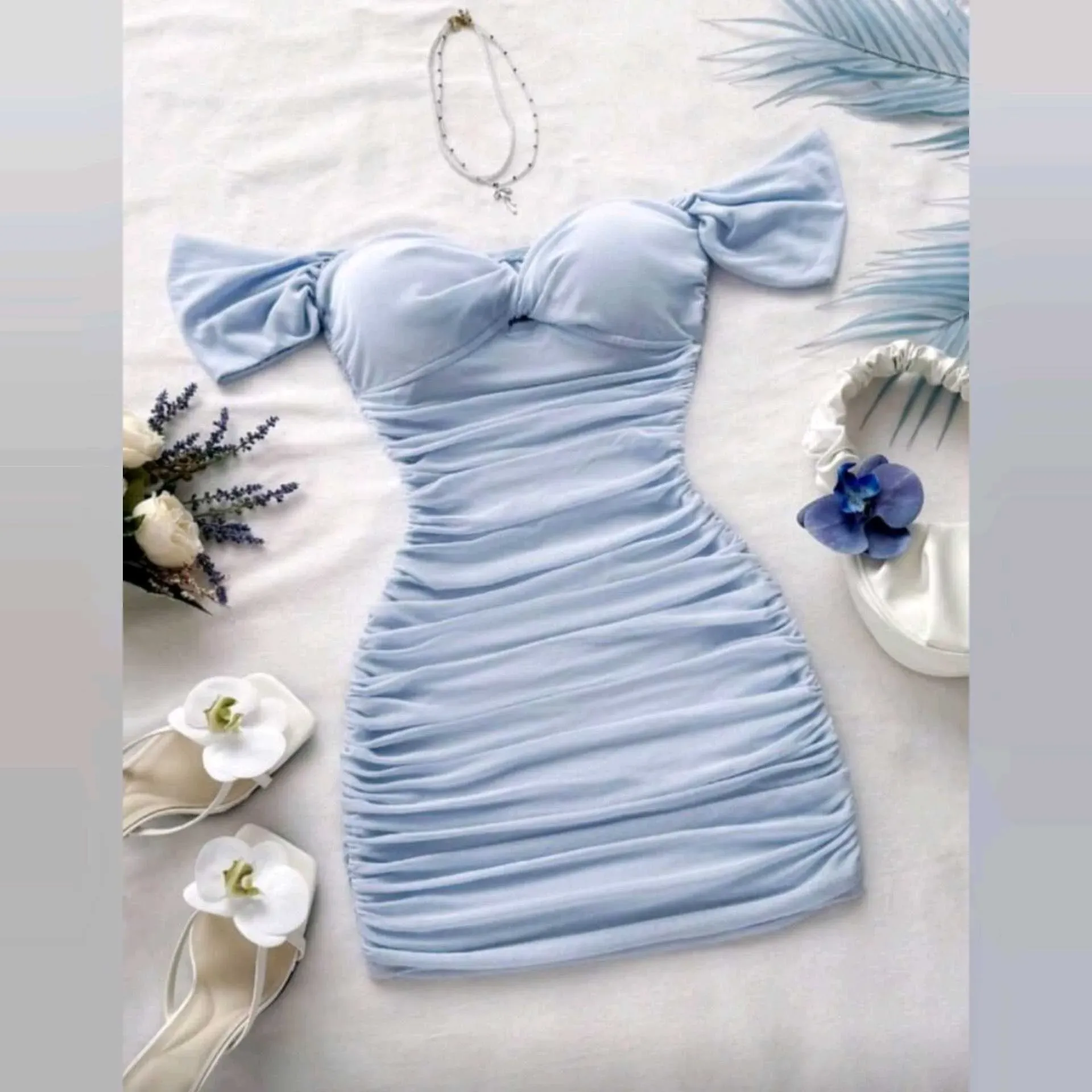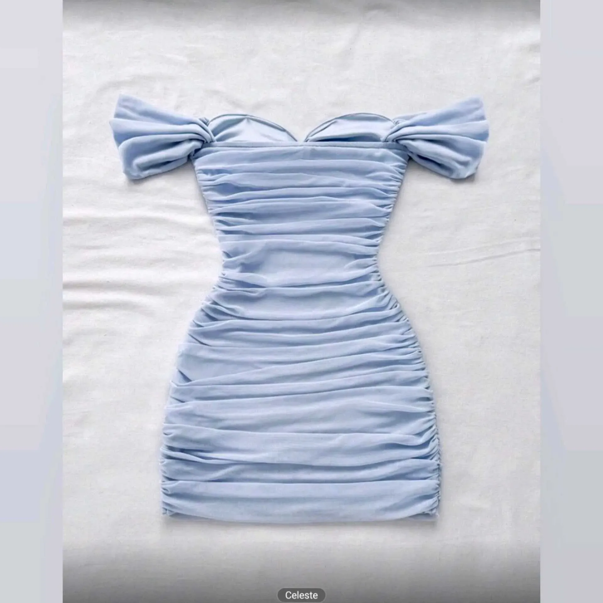 💙 Vestido de Malla forrado con Hombros Descubiertos y Fruncido Lateral — Soleia CollectionDelicado, femenino y perfecto para tus vacaciones o eventos especiales ✨Este vestido ajustado de punto con escote de hombros descubiertos realza tu figura con un to