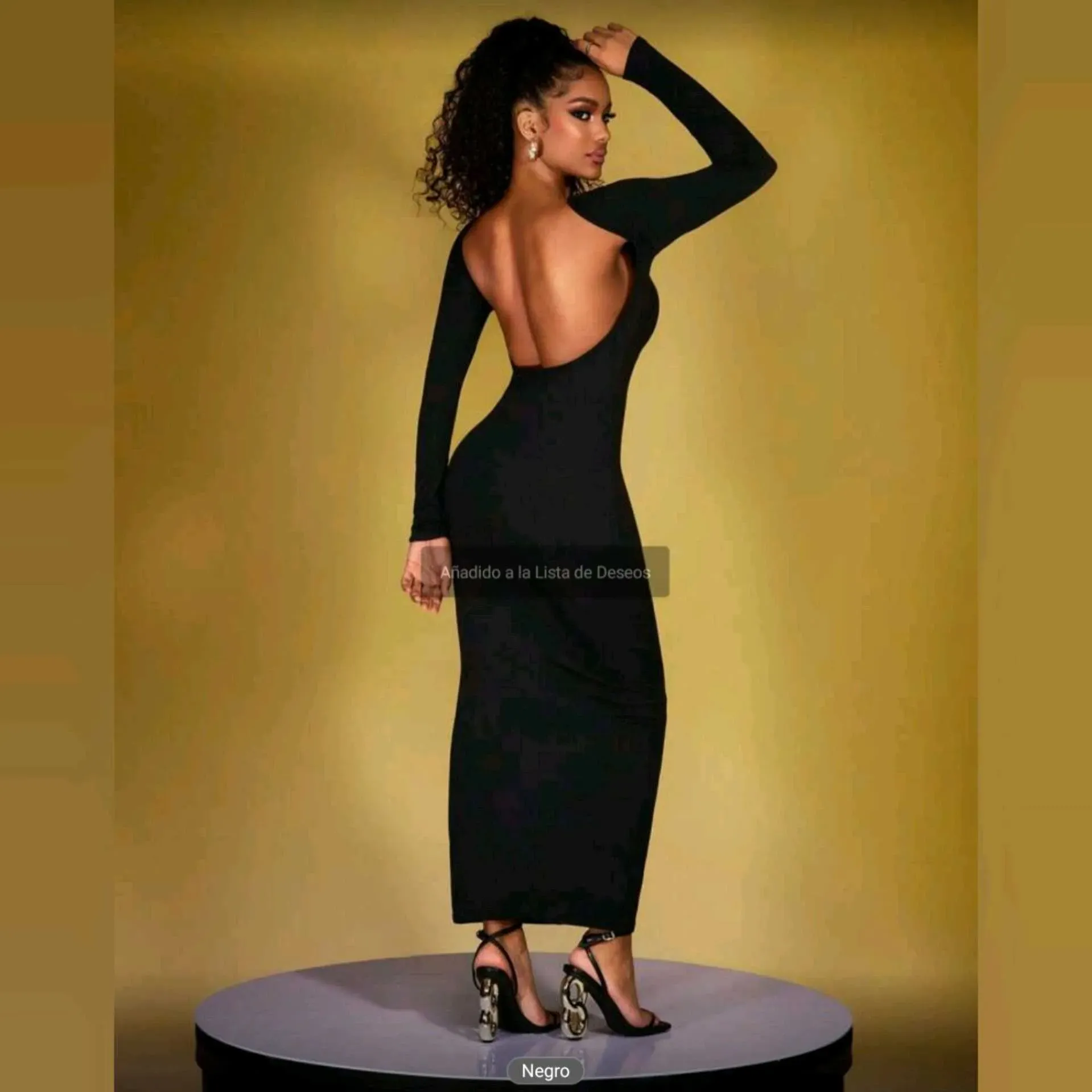 Vestido Ligero Largo Negro con Espalda Descubierta – Elegancia Atemporal 🖤Un clásico que redefine la sensualidad con sutileza y clase ✨Este vestido largo negro de manga larga es la combinación perfecta entre sofisticación y glamour. Su diseño entallado r
