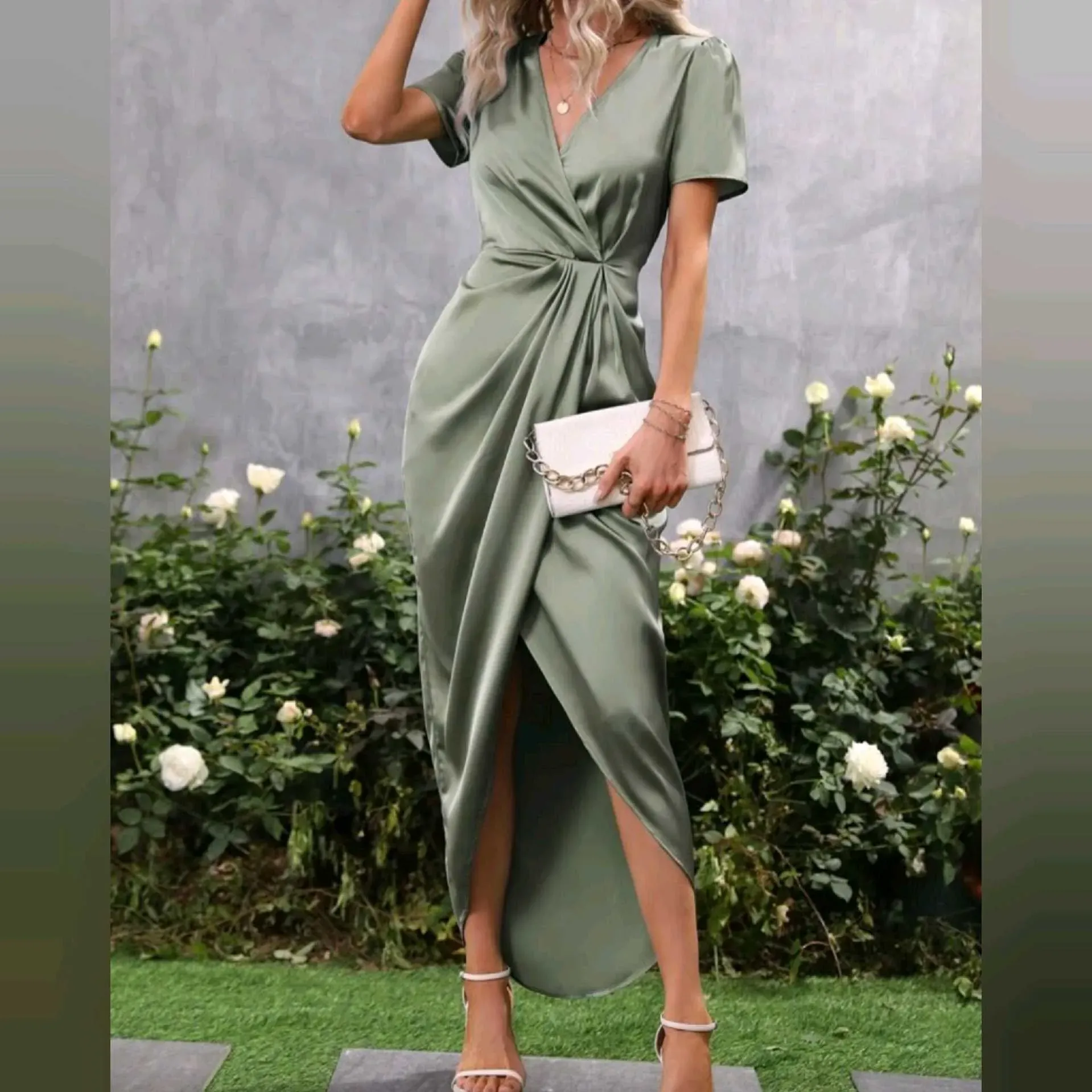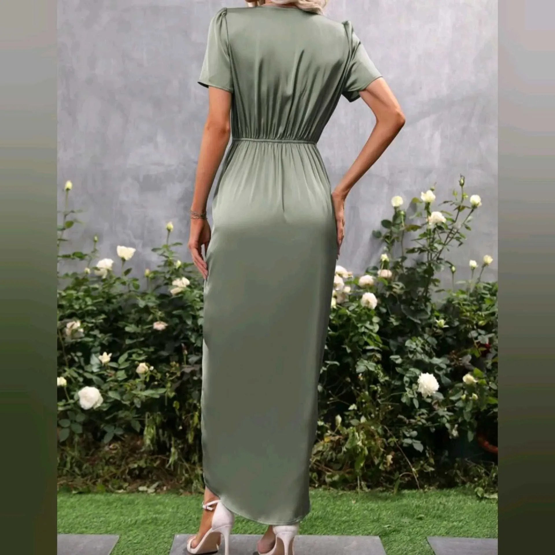 Vestido Maxi de Satén con Cintura Fruncida y Abertura Delantera Elegancia que deslumbra 🌿Vestido largo con delicado cruce al frente y detalle fruncido que estiliza la figura.Su tela satinada tiene un brillo sutil que lo hace ideal para cenas, eventos o c