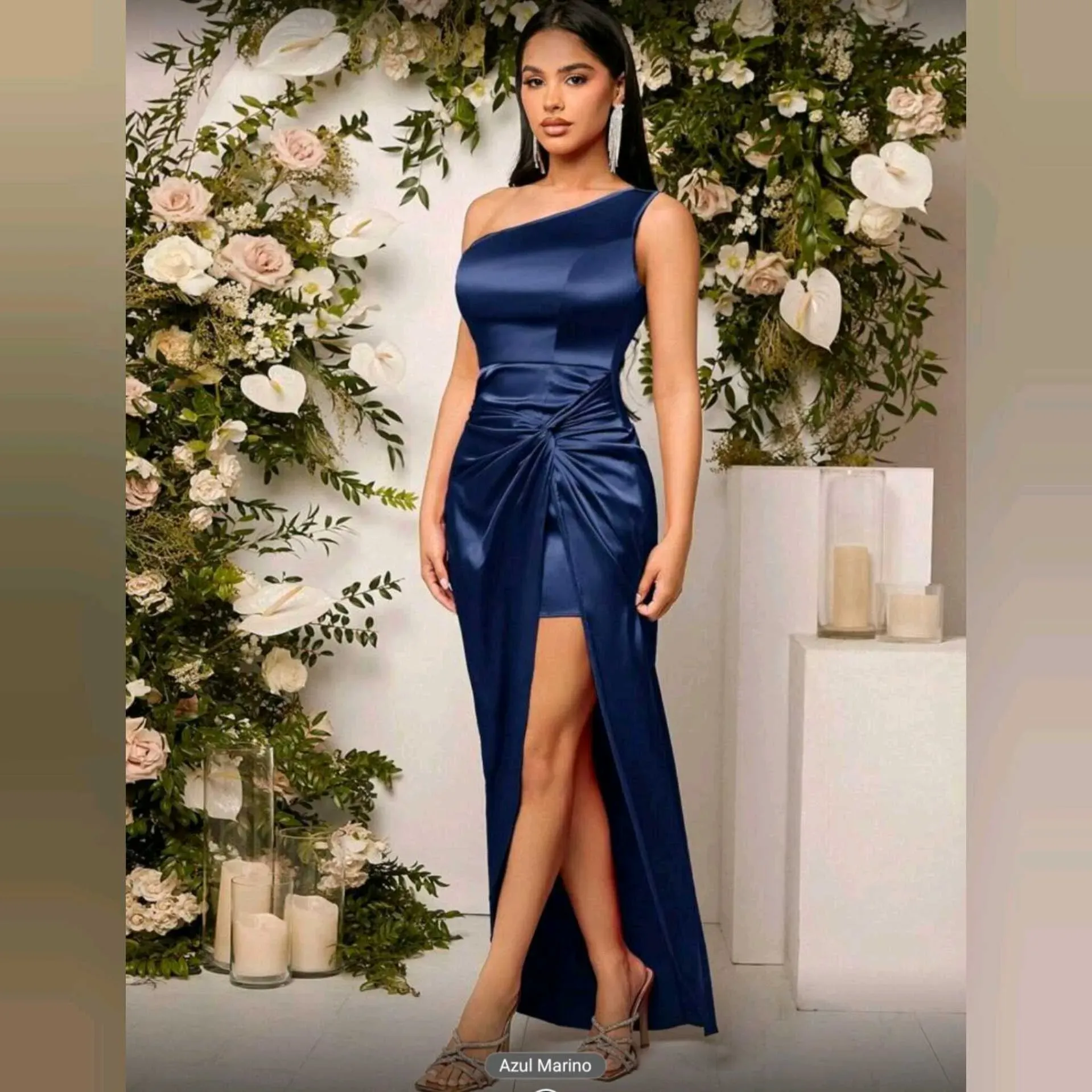 Vestido Satinado Asimétrico – Azul Marino Elegante 💙Refinado, moderno y perfecto para deslumbrar ✨Este vestido largo en satín azul marino combina elegancia clásica con un toque contemporáneo. Su diseño de un solo hombro y el fruncido lateral con abertura