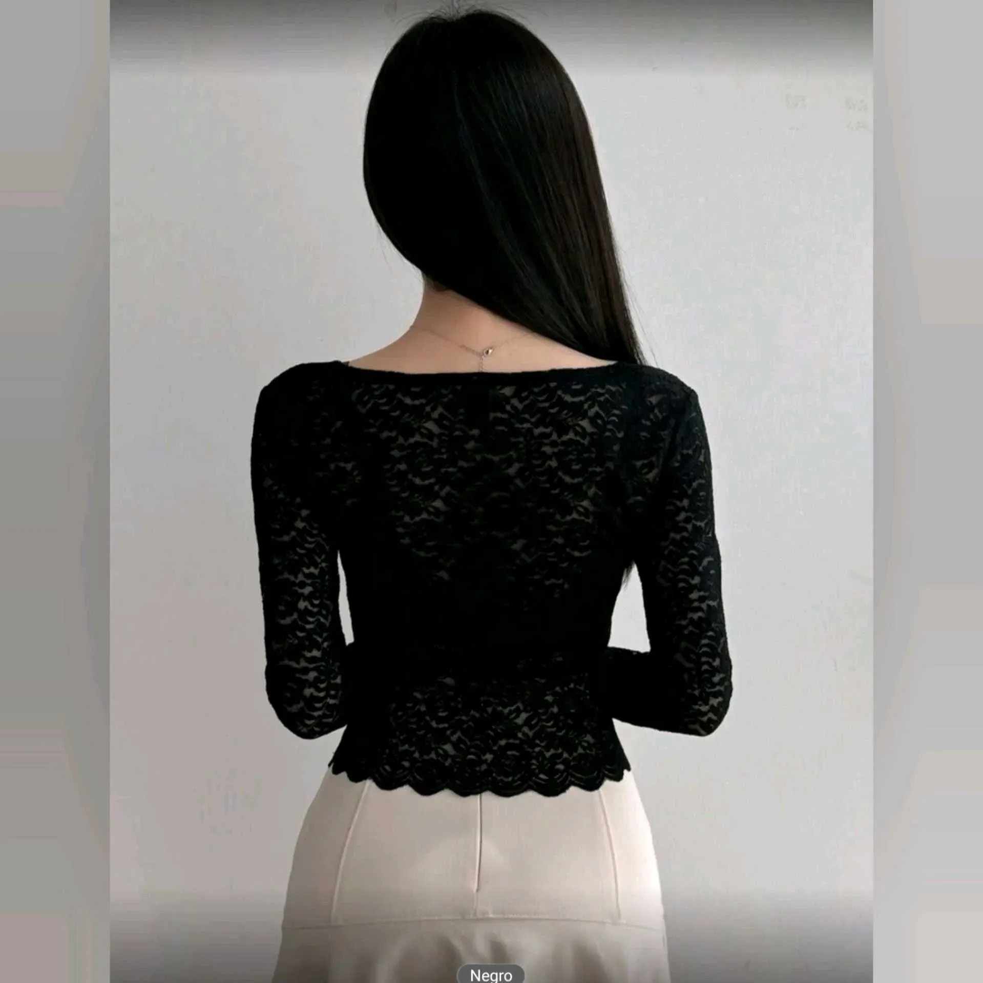 🖤 Blusa DAZY de Encaje Premium con Escote en V y Manga LargaElegante, femenina y con un toque de sofisticación ✨Esta blusa DAZY combina encaje negro premium con un corte ceñido y favorecedor.Su diseño transparente con escote en V festoneado resalta la si