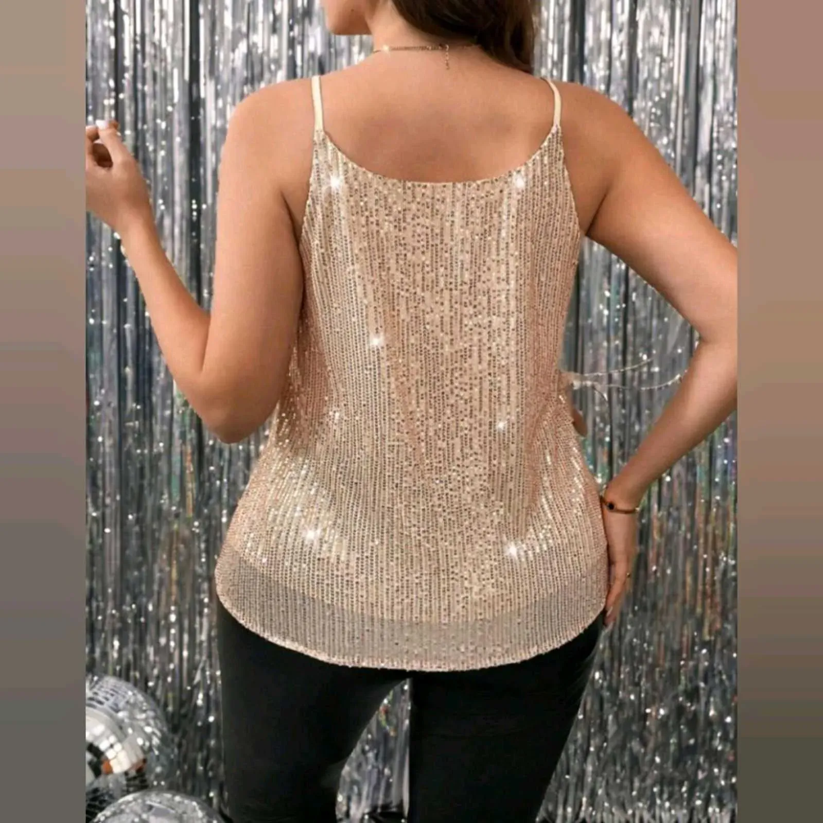 ✨ Blusa Dorada de Lentejuelas – Glamour Total ✨Brilla con estilo en cada celebración 🌟Esta blusa Shein de tirantes finos con lentejuelas doradas claras es la elección perfecta para eventos, cenas o noches especiales. Su diseño tipo camisilla con escote e