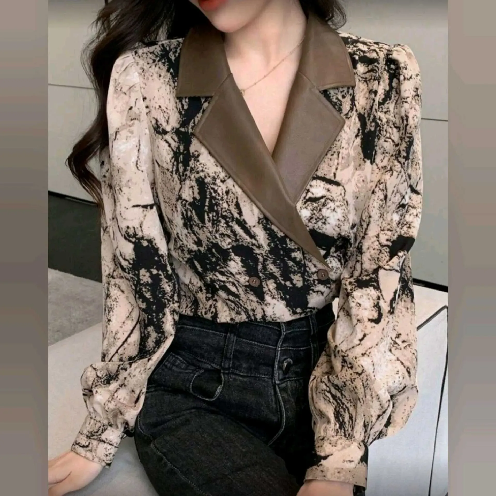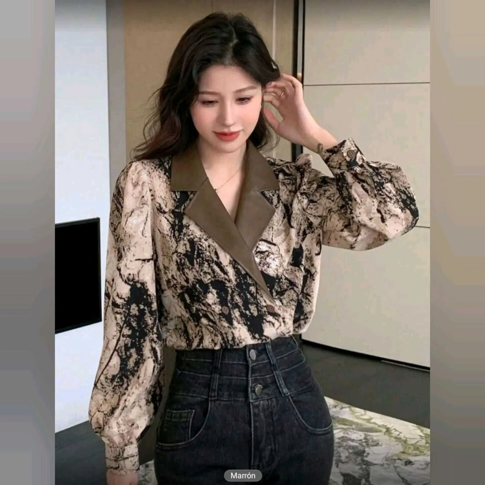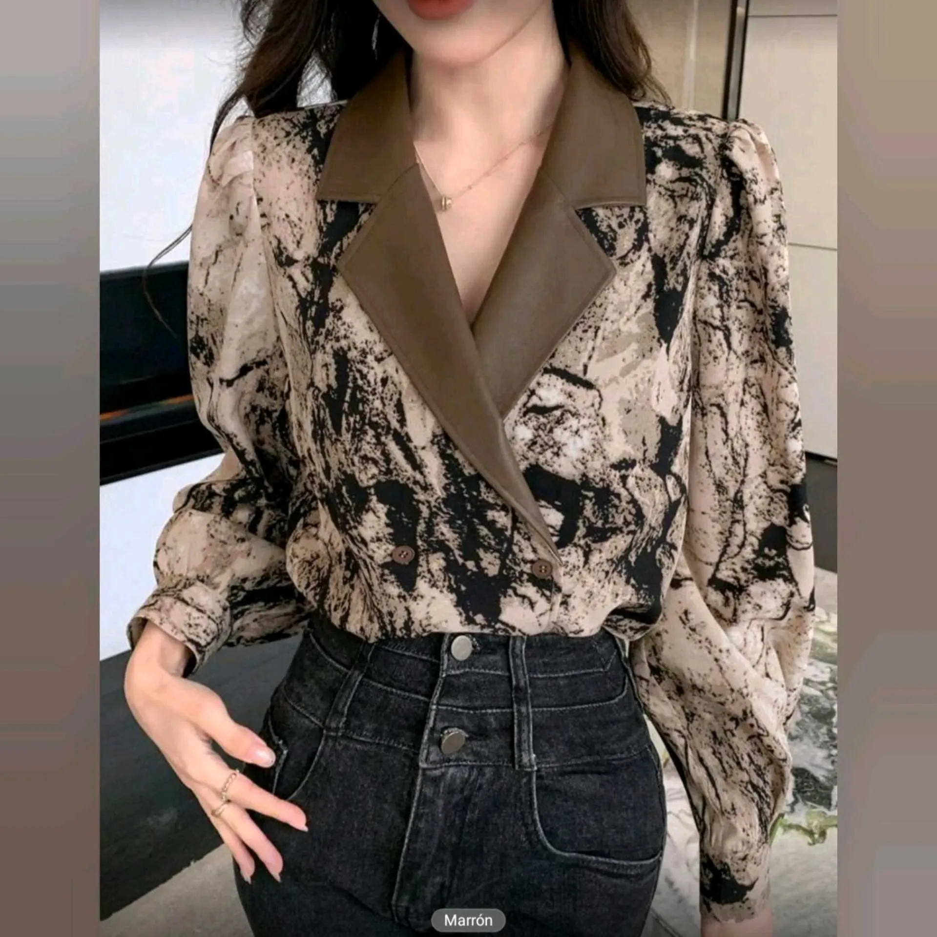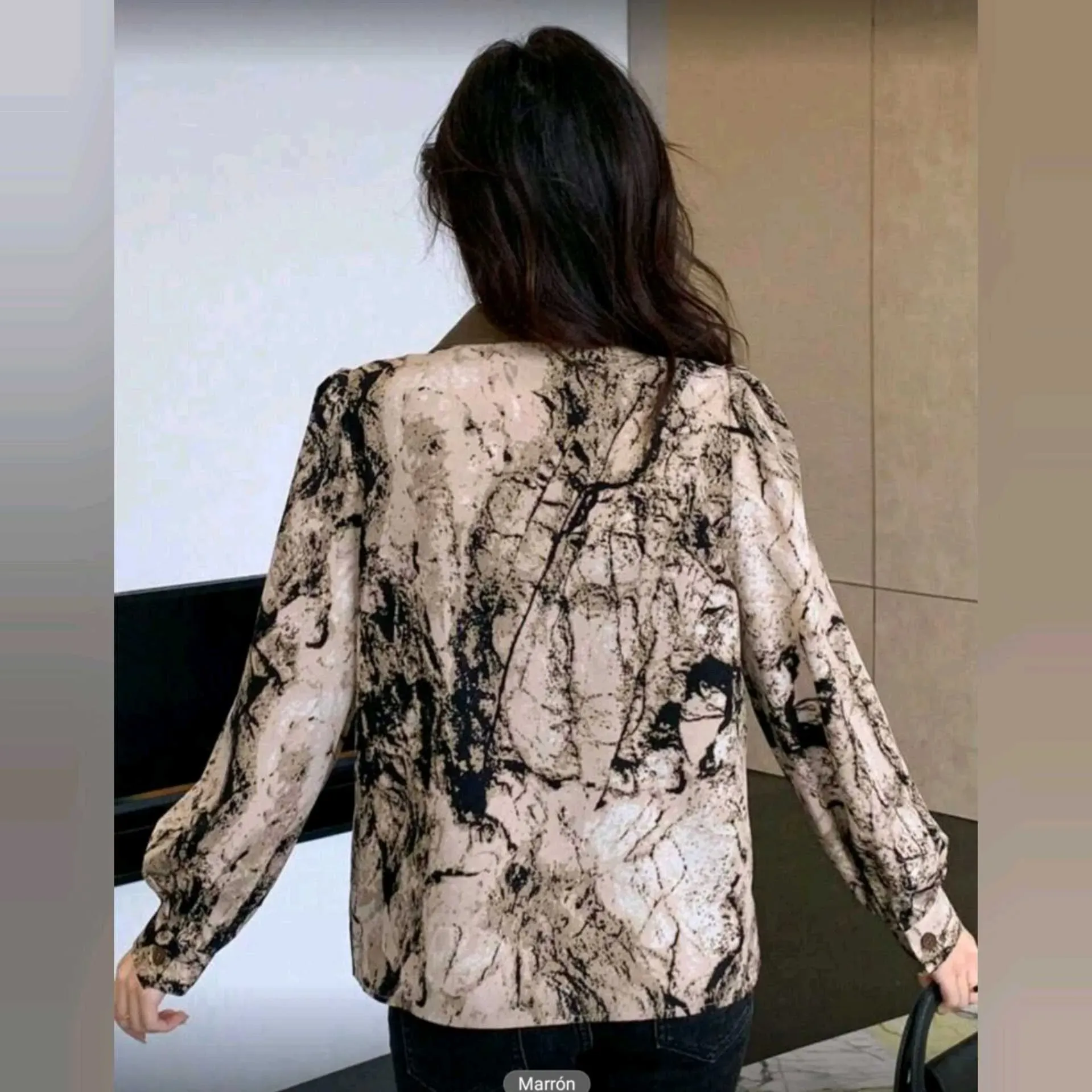 ✨ Blusa Marca Dazy Estampada con Solapa de Cuerina y Mangas Largas Elegantes ✨Una prenda que combina estilo sofisticado y modernidad. Esta blusa destaca por su estampado marmoleado en tonos beige y negro, que aporta un aire artístico y único. El detalle m