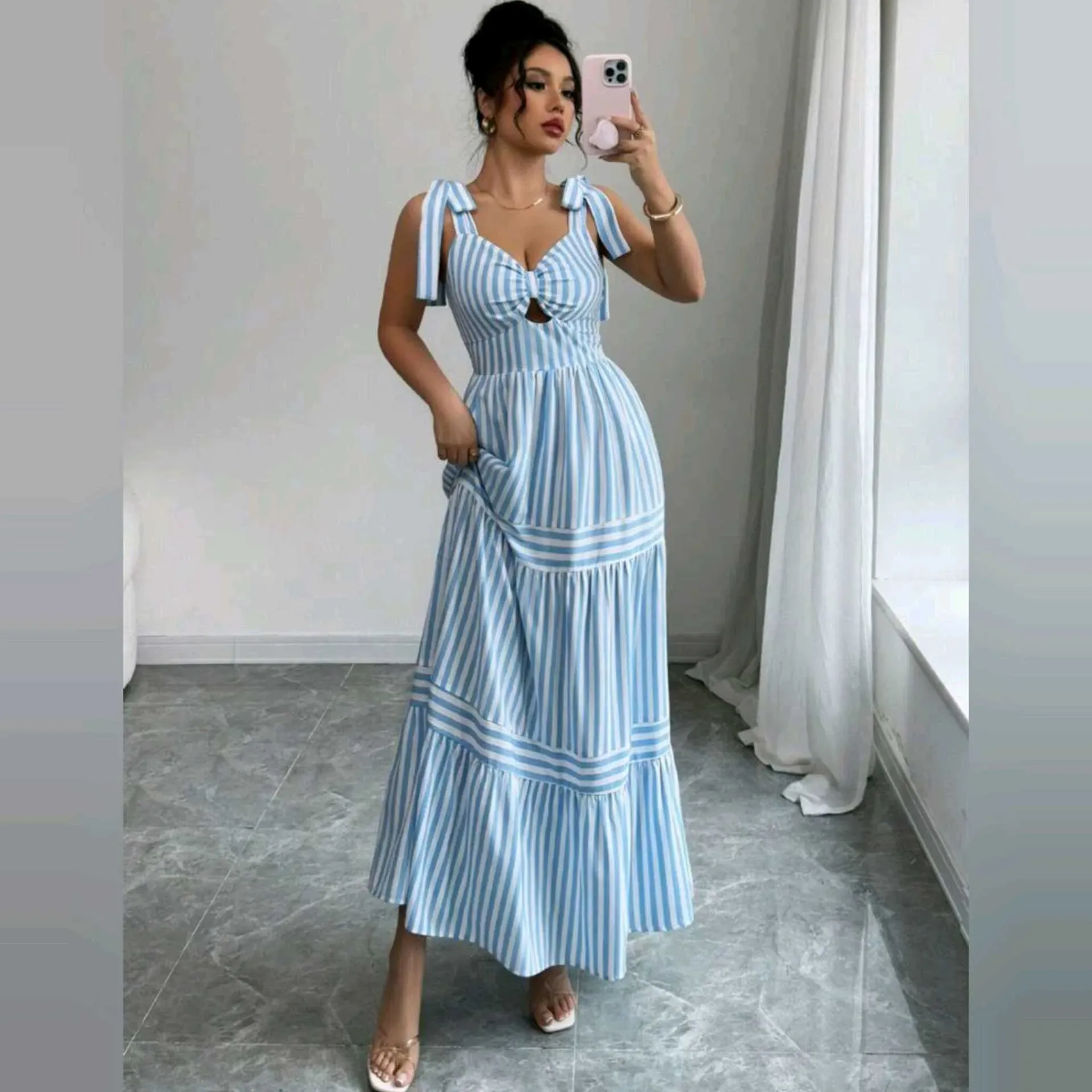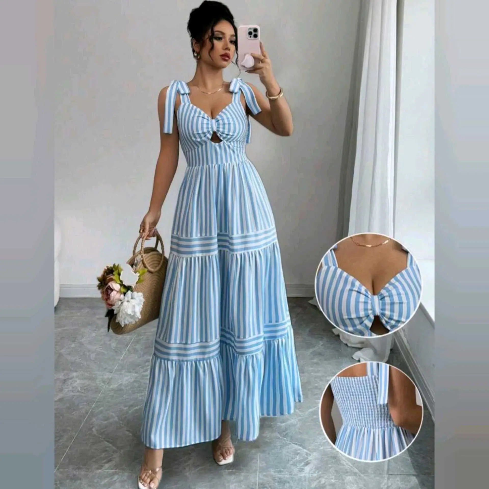 ✨ Maxi Vestido Rayas Azul & Blanco – Frescura y Estilo ✨Un vestido ideal para esta temporada:✔ Diseño largo con rayas verticales que estilizan la figura.✔ Tirantes con moños ajustables para un toque femenino y delicado.✔ Corte con detalle fruncido