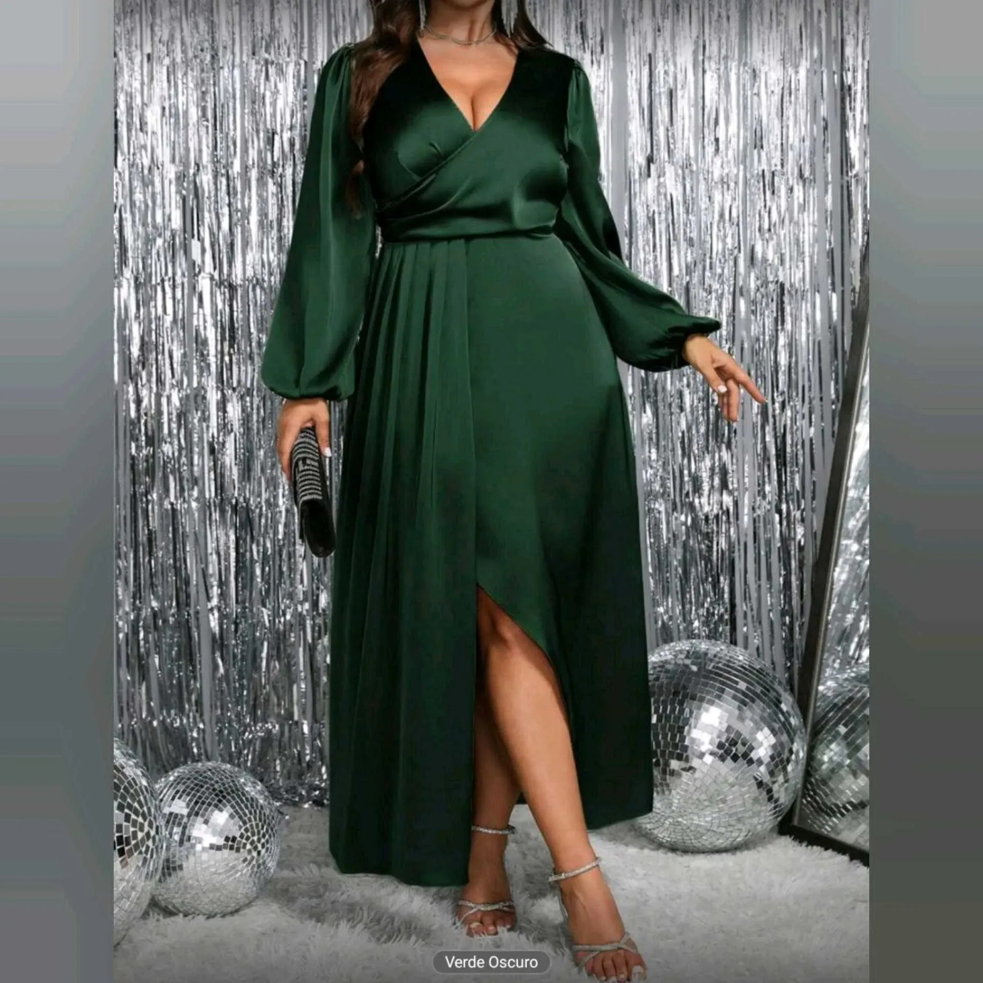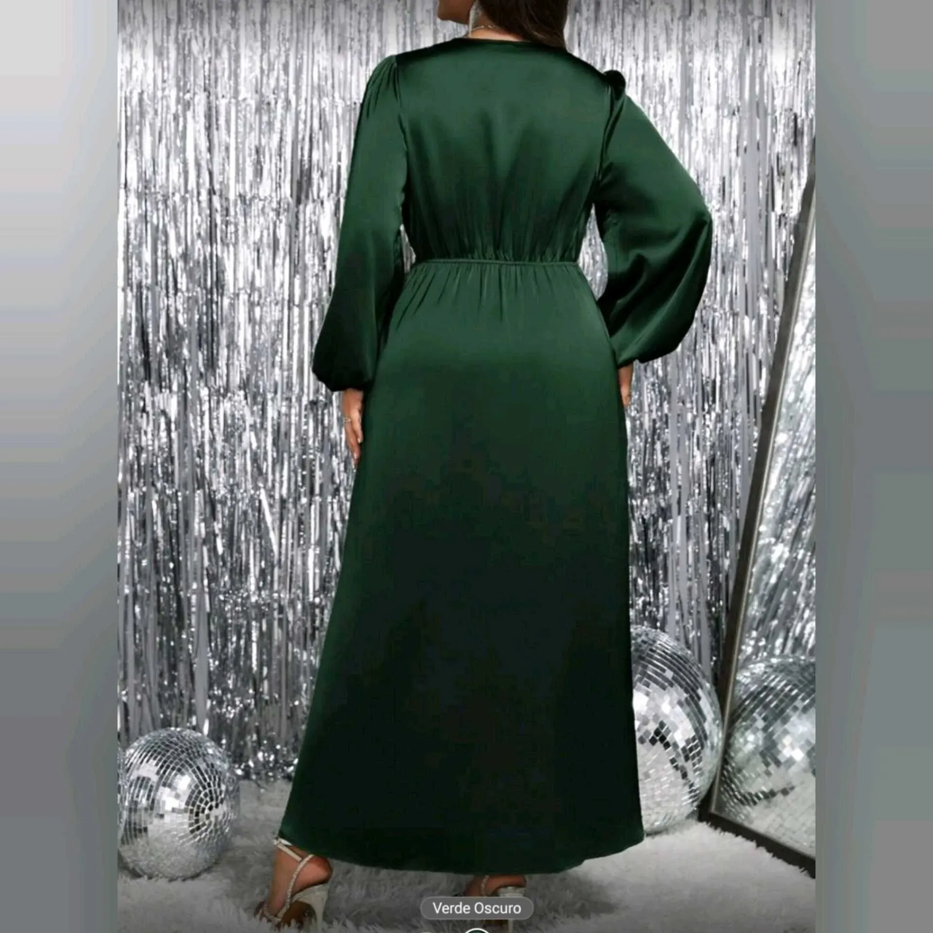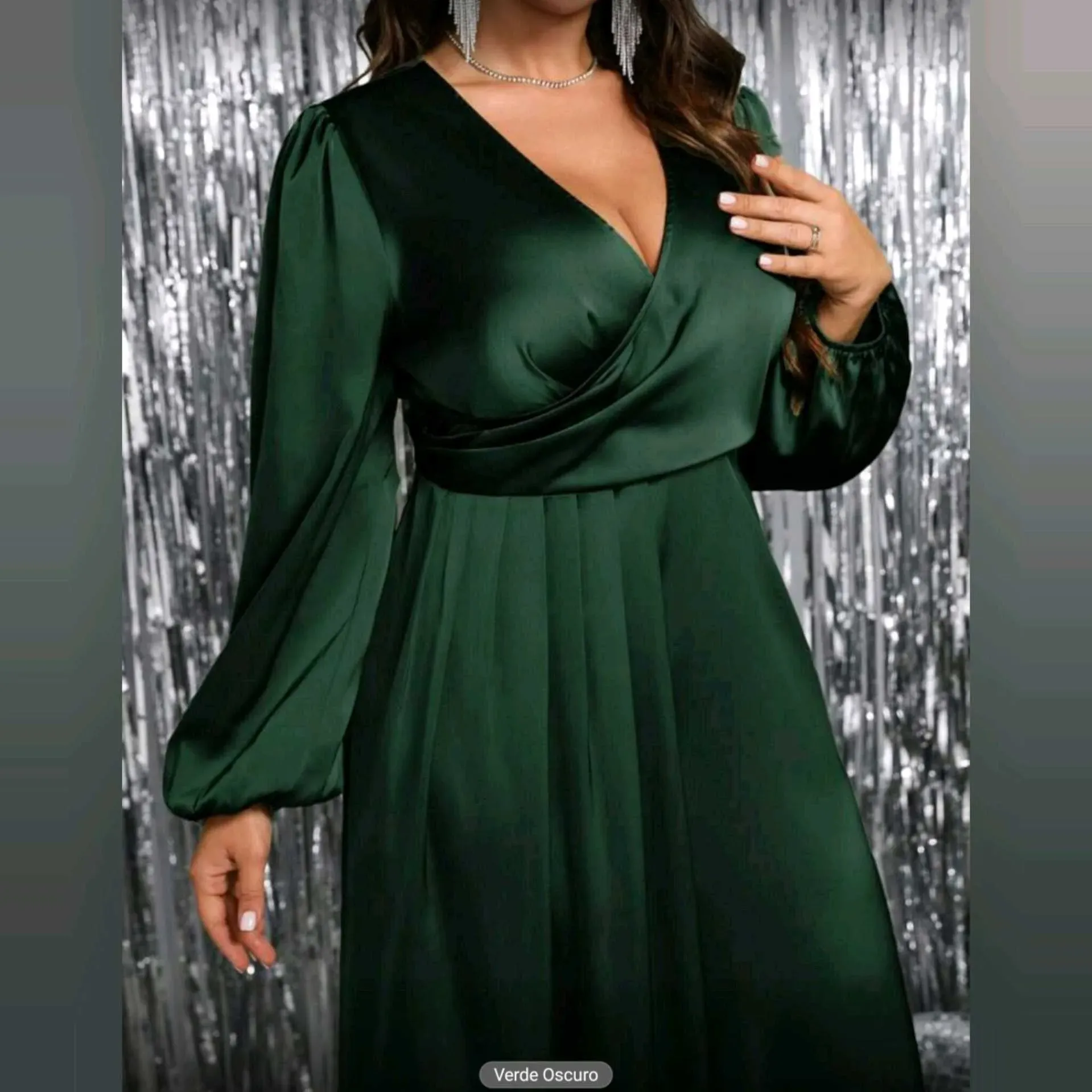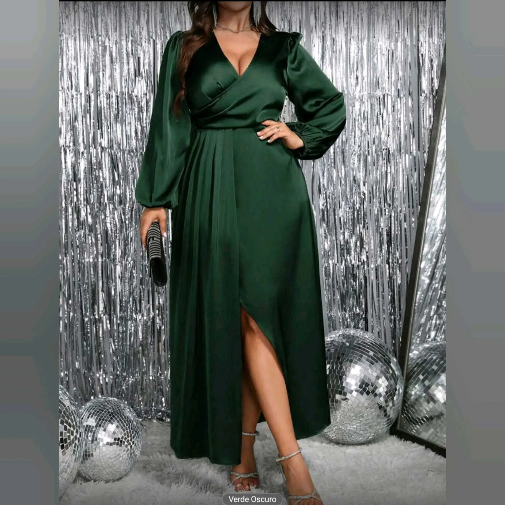💚 Vestido Celure Curvy – Elegancia y Estilo con ConfianzaDeslumbra en cada ocasión con este diseño elegante y sofisticado ✨El Vestido Celure combina el brillo sutil del satén con un escote cruzado tipo envolvente, ideal para realzar tu figura de forma na