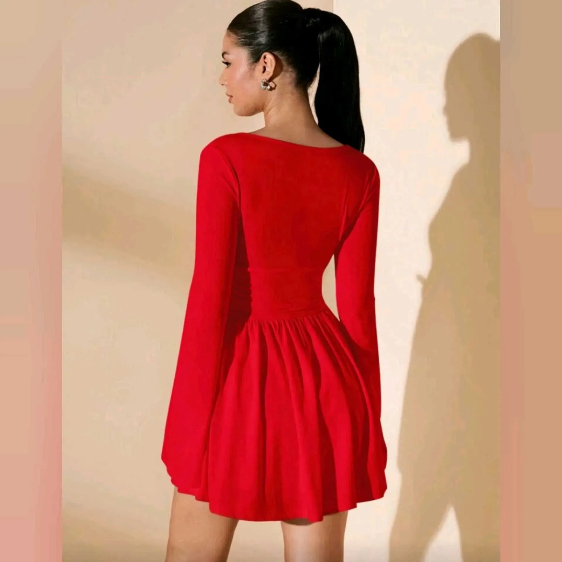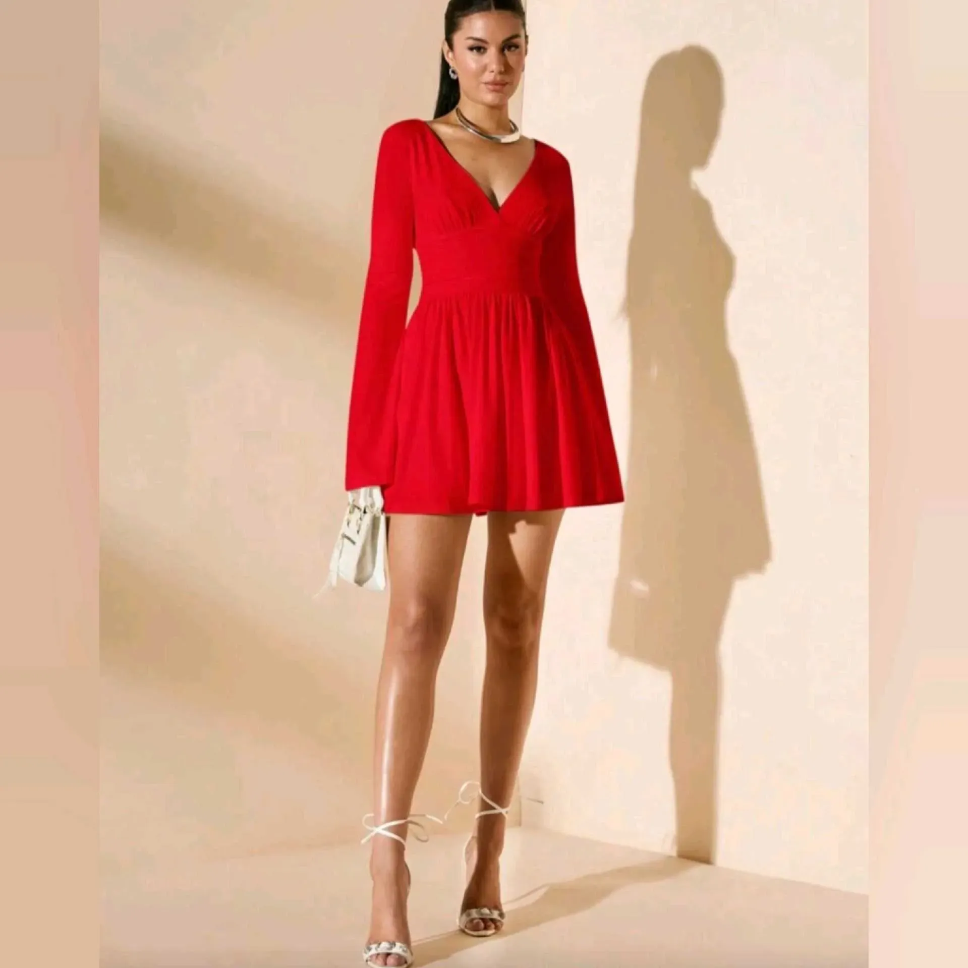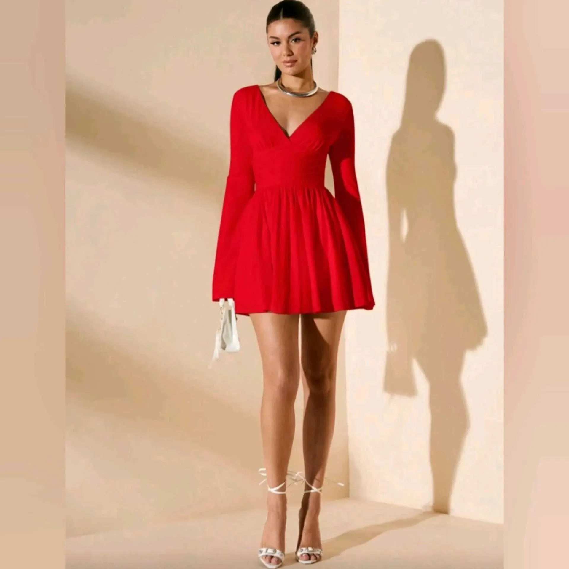 ❤️ Vestido Corto Rojo SHEIN BAE con Manga Larga y Cuello en V ProfundoBrilla esta temporada con un diseño elegante y femenino 💫Su corte mini con falda amplia crea una silueta encantadora, mientras que el escote en V profundo y las mangas largas con vuelo