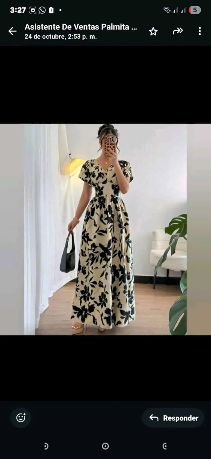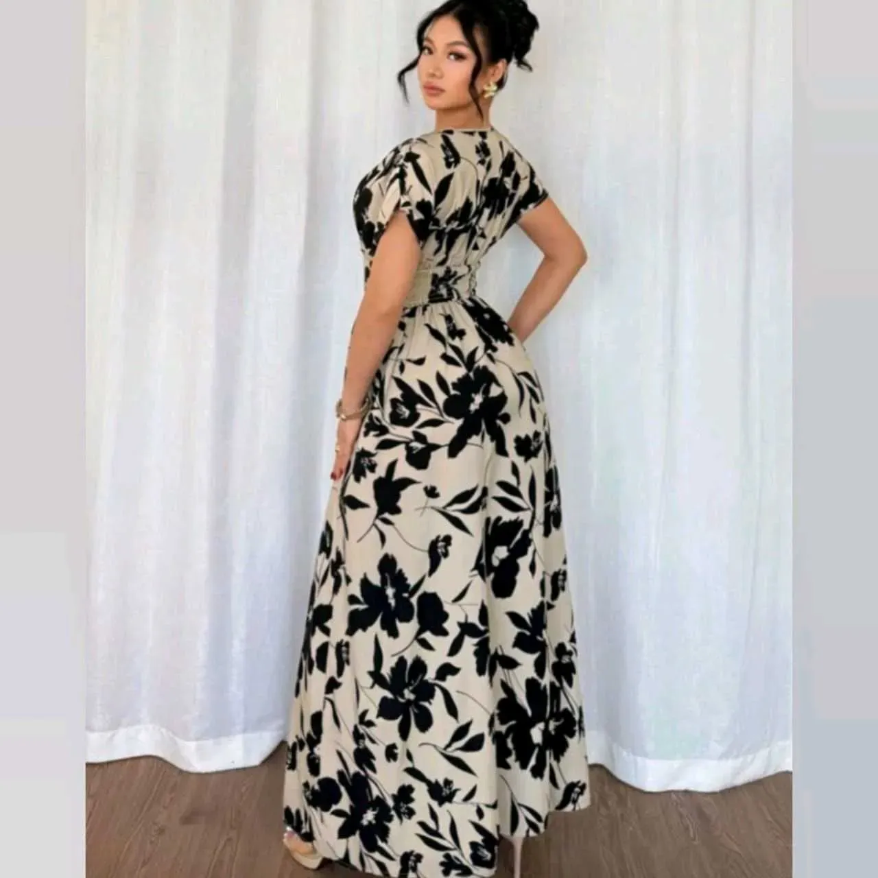 🌼 Vestido Largo Estilo Floral – Elegancia Natural y Silueta PerfectaUn vestido que combina frescura, elegancia y movimiento 🍃Este vestido largo con estampado floral negro sobre fondo beige realza la figura con su corte en la cintura y escote en V, logra