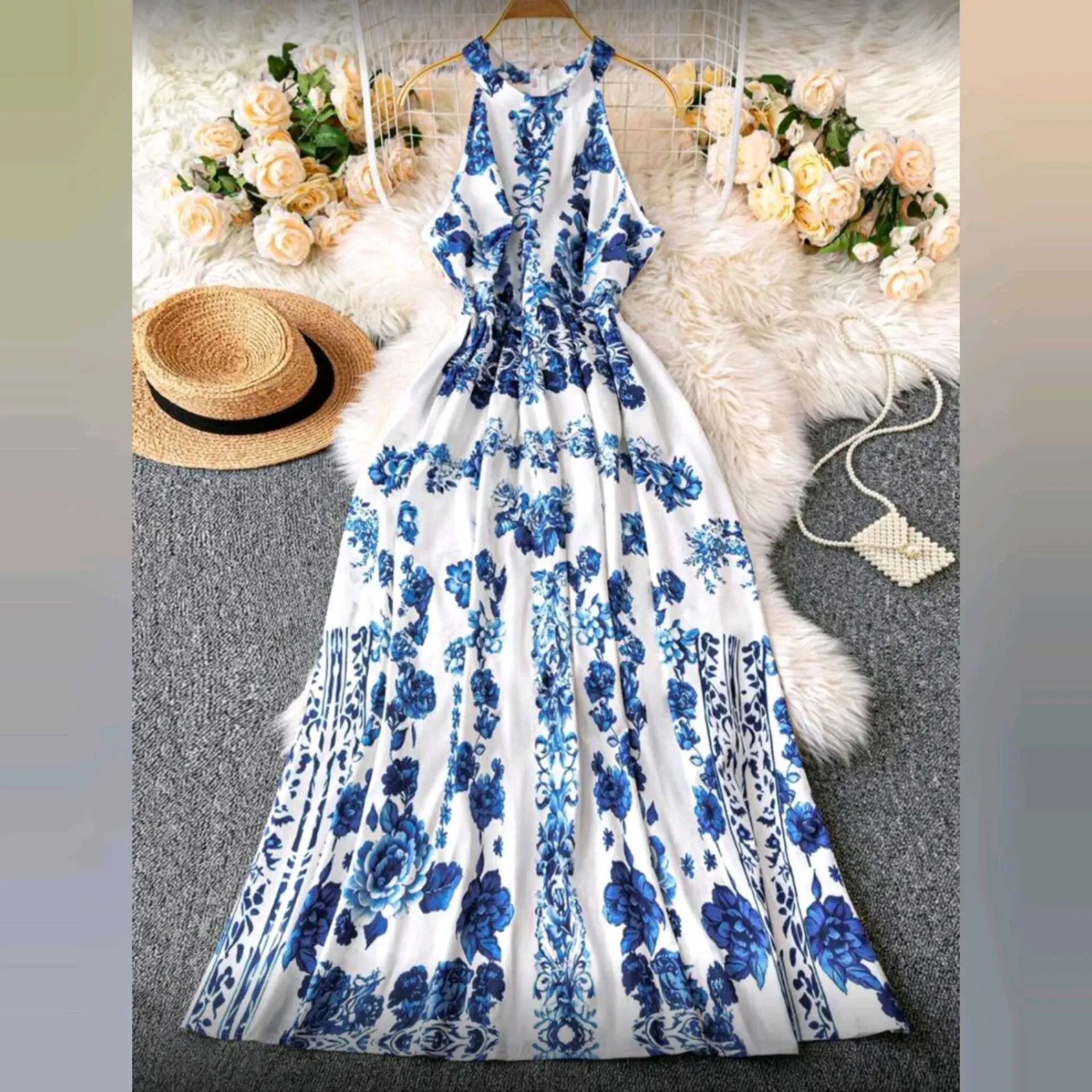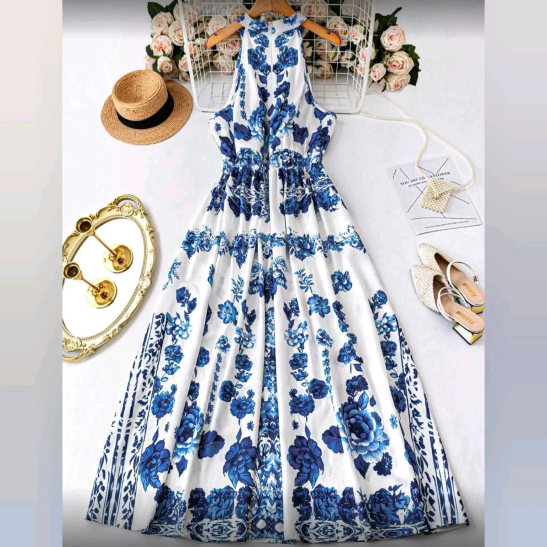 💙 Vestido Maxi Estilo Porcelana con Estampado Floral Azul y Escote Halter 💙Un diseño fresco y elegante que te transporta a la delicadeza de la porcelana fina. Este vestido maxi blanco con flores en tonos azules combina lo mejor de la moda veraniega con