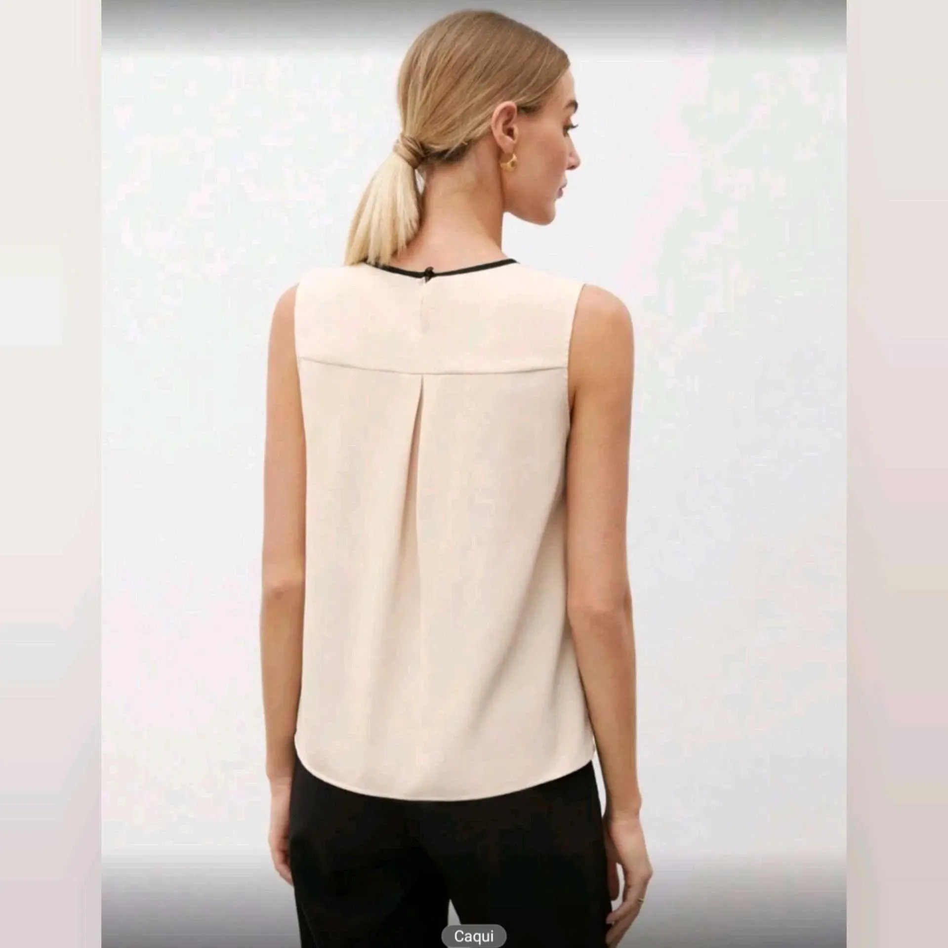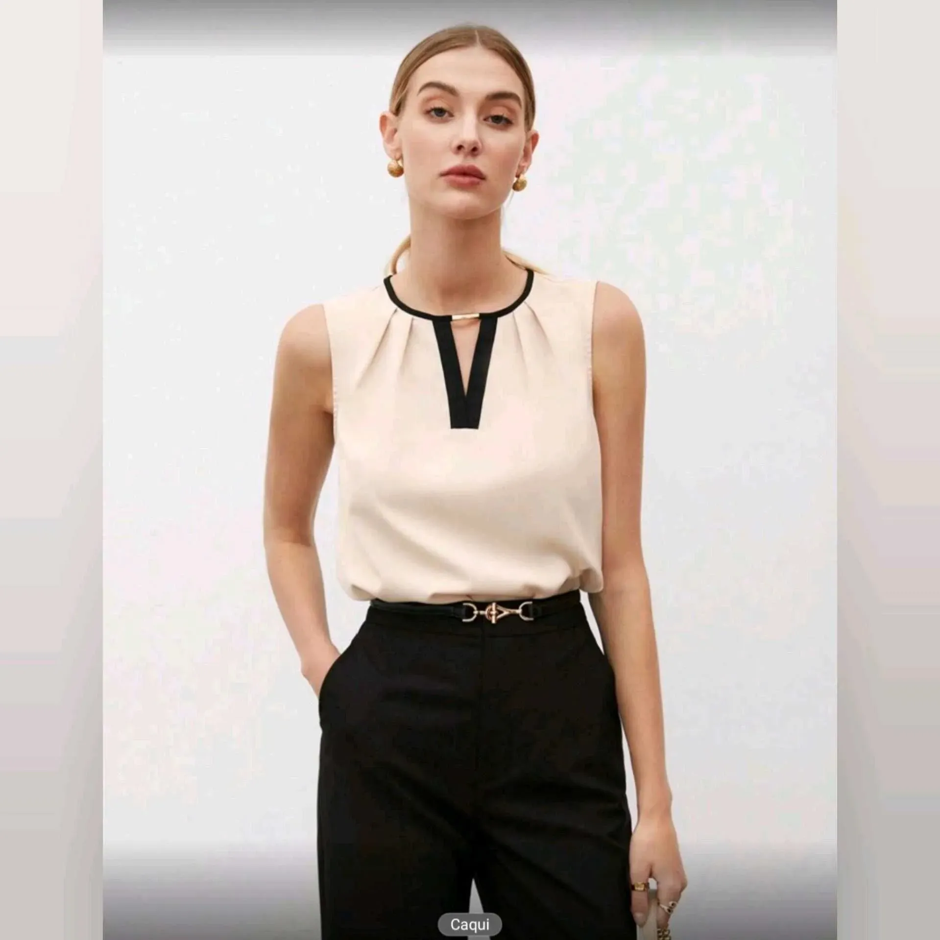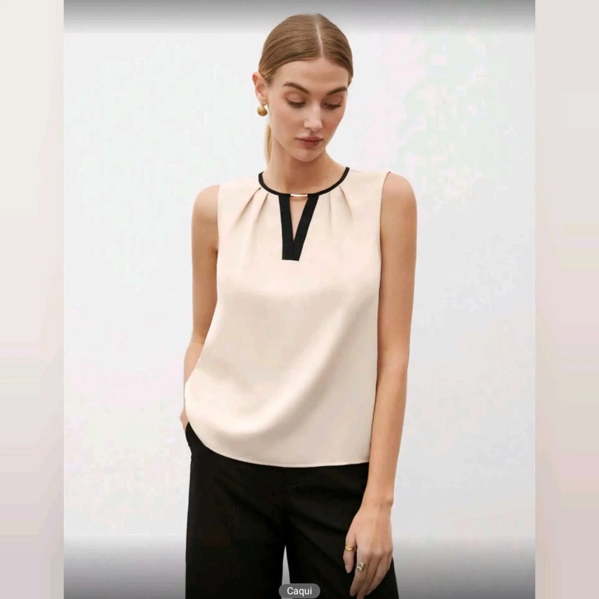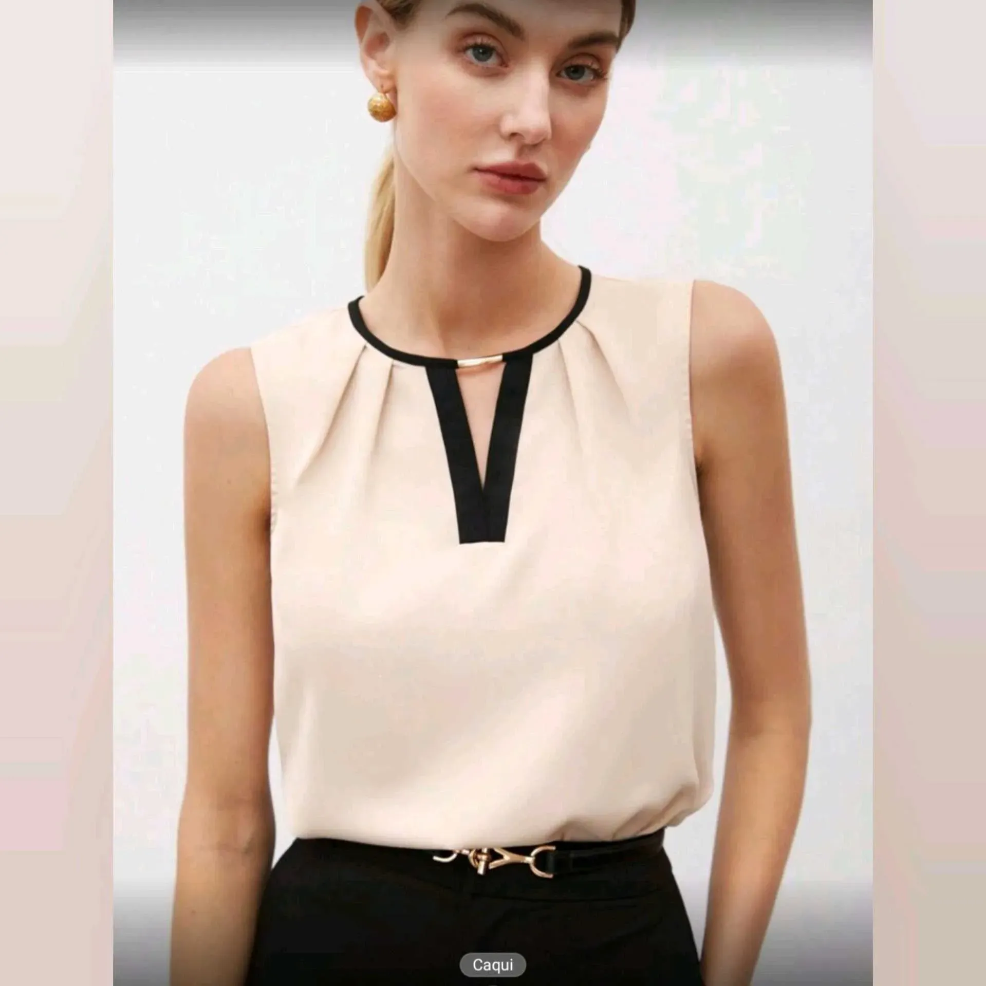 Blusa Minimalista con detalle Negro en el Cuello y plaquita – Estilo Ejecutivo y SofisticadoElegancia y sencillez que nunca fallan ✨Esta blusa sin mangas combina el tono caqui suave con detalles en negro en el cuello y escote, creando un contraste moderno
