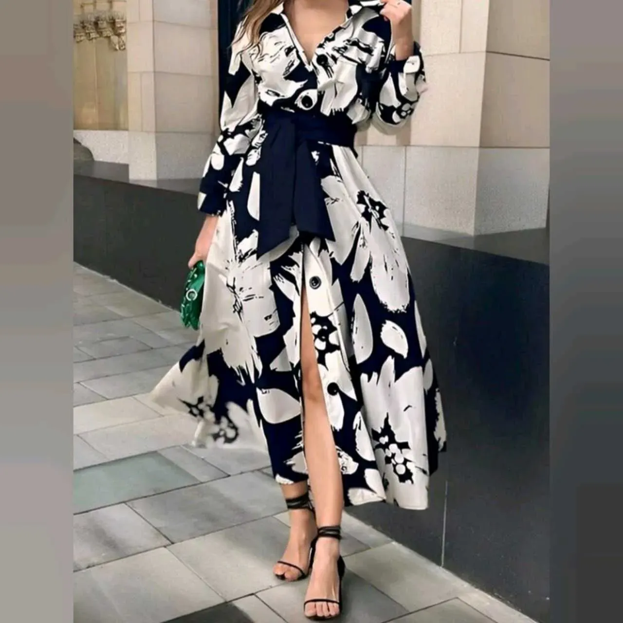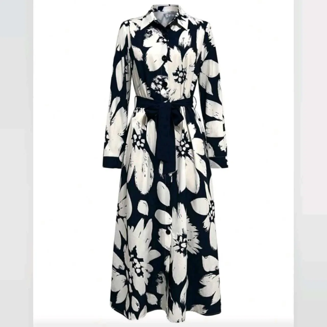 Vestido Camisero Floral en Beige y Azul Marino – Elegancia Atemporal con Toque ModernoUn vestido que redefine la elegancia clásica 🌸Este vestido camisero largo con estampado floral en blanco y negro destaca por su cintura ajustada y falda fluida con aber