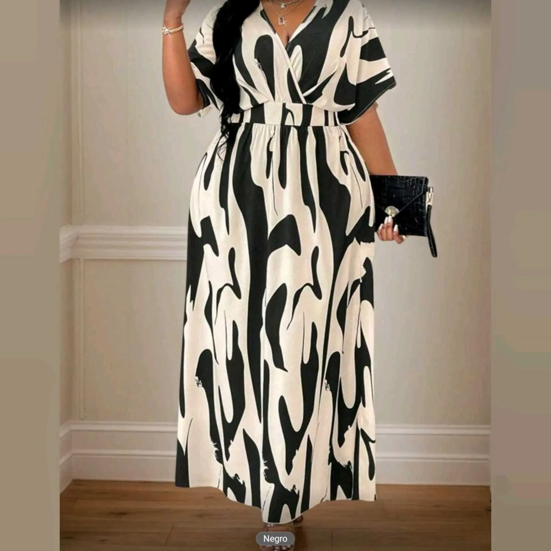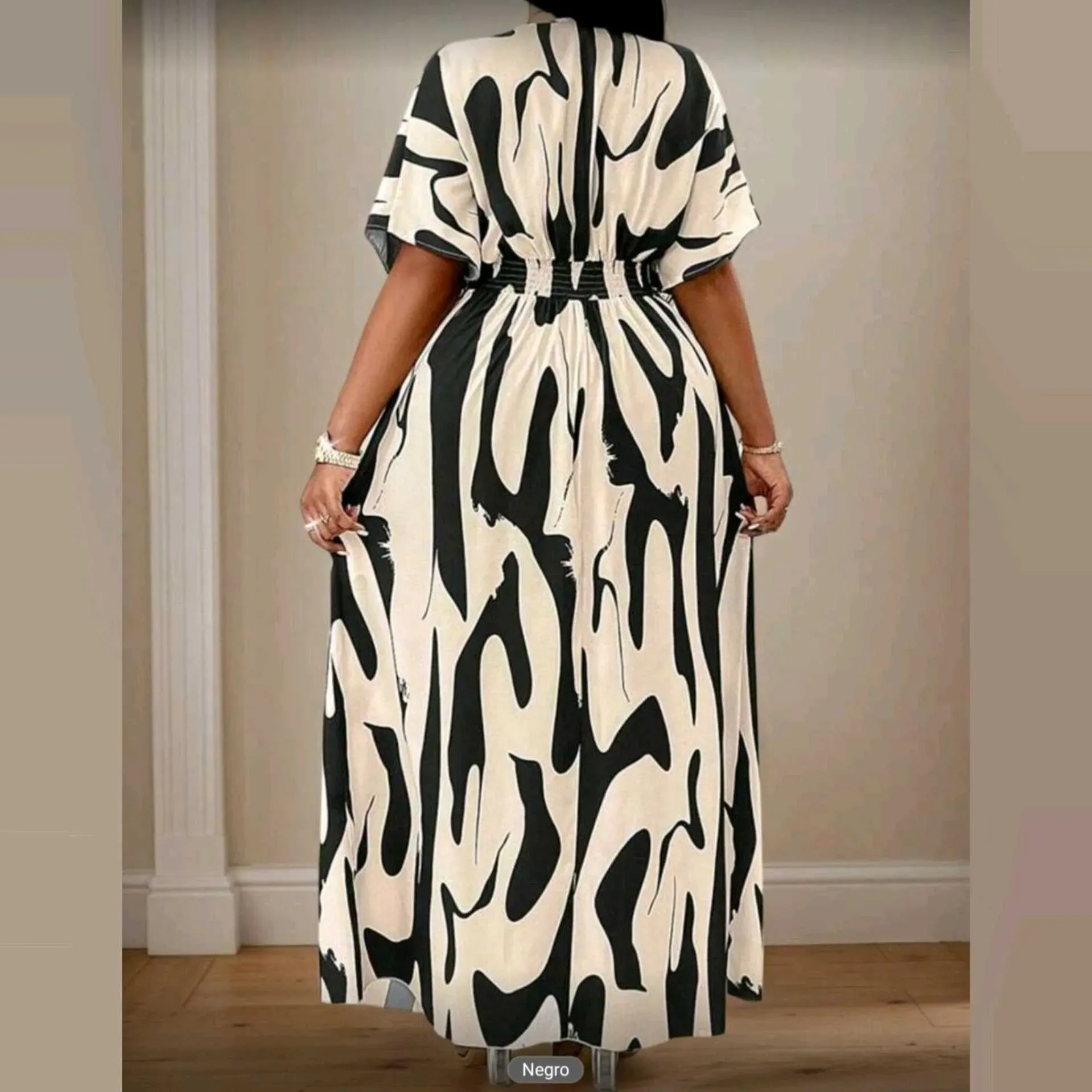 Vestido Largo Negro con Estampado Abstracto — Palmita Curve CollectionModerno, elegante y con un estilo que roba miradas ✨Este vestido largo con estampado abstracto en tonos negro y beige es ideal para quienes buscan una prenda cómoda, fresca y con un toq