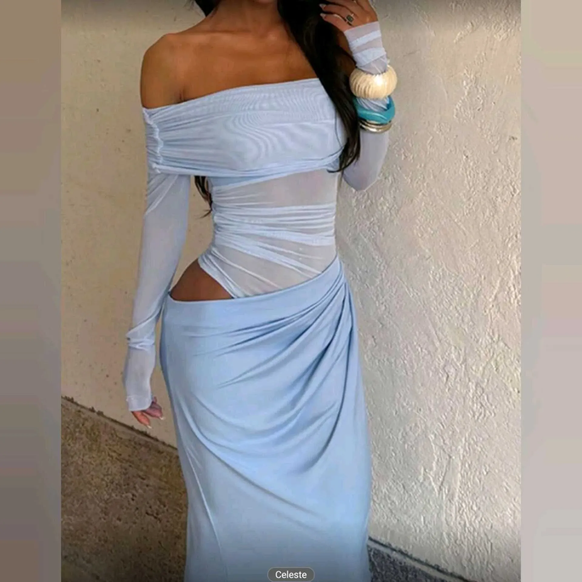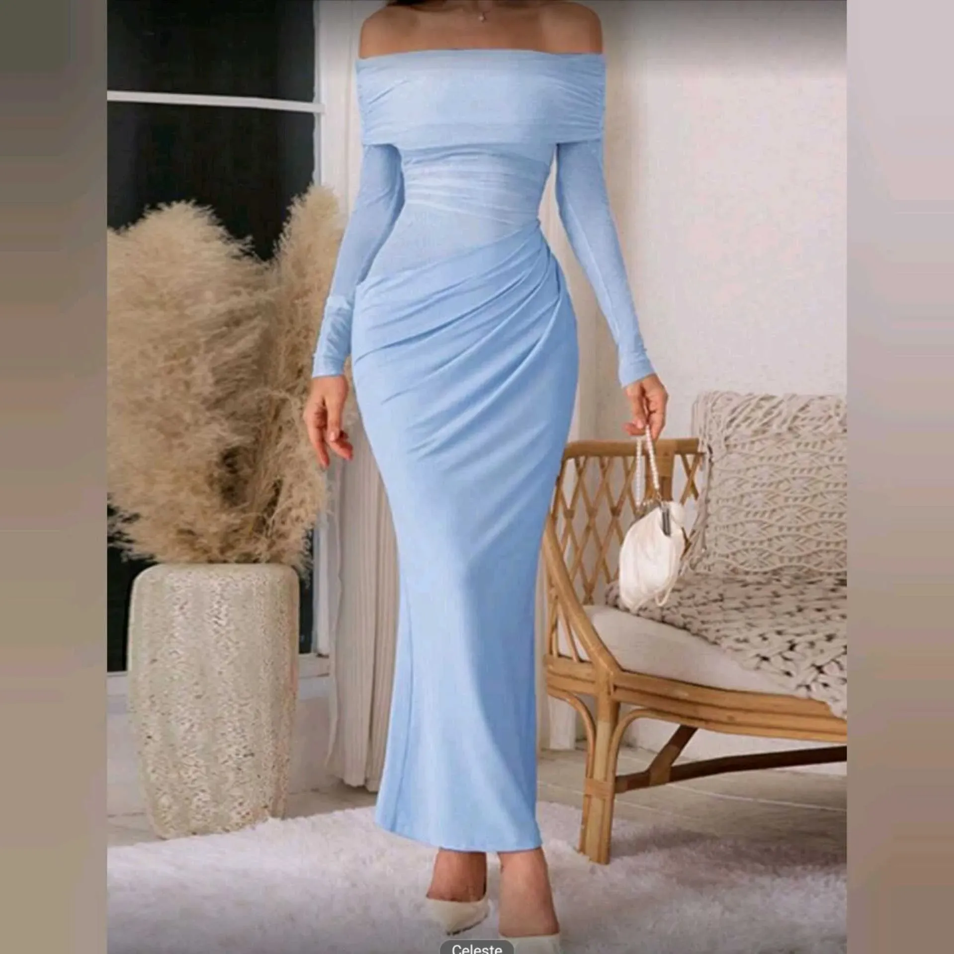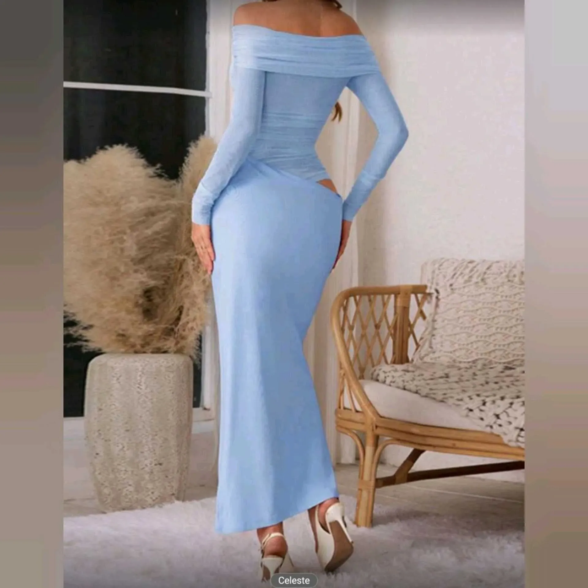 Vestido Midi Celeste Off ShoulderVestido ultra tendencia que estiliza la figura con diseño hombros descubiertos, efecto drapeado y corte ajustado que realza la silueta. Ideal para eventos, cenas o looks elegantes de noche.🔹 Color: Celeste🔹 Corte: Midi /